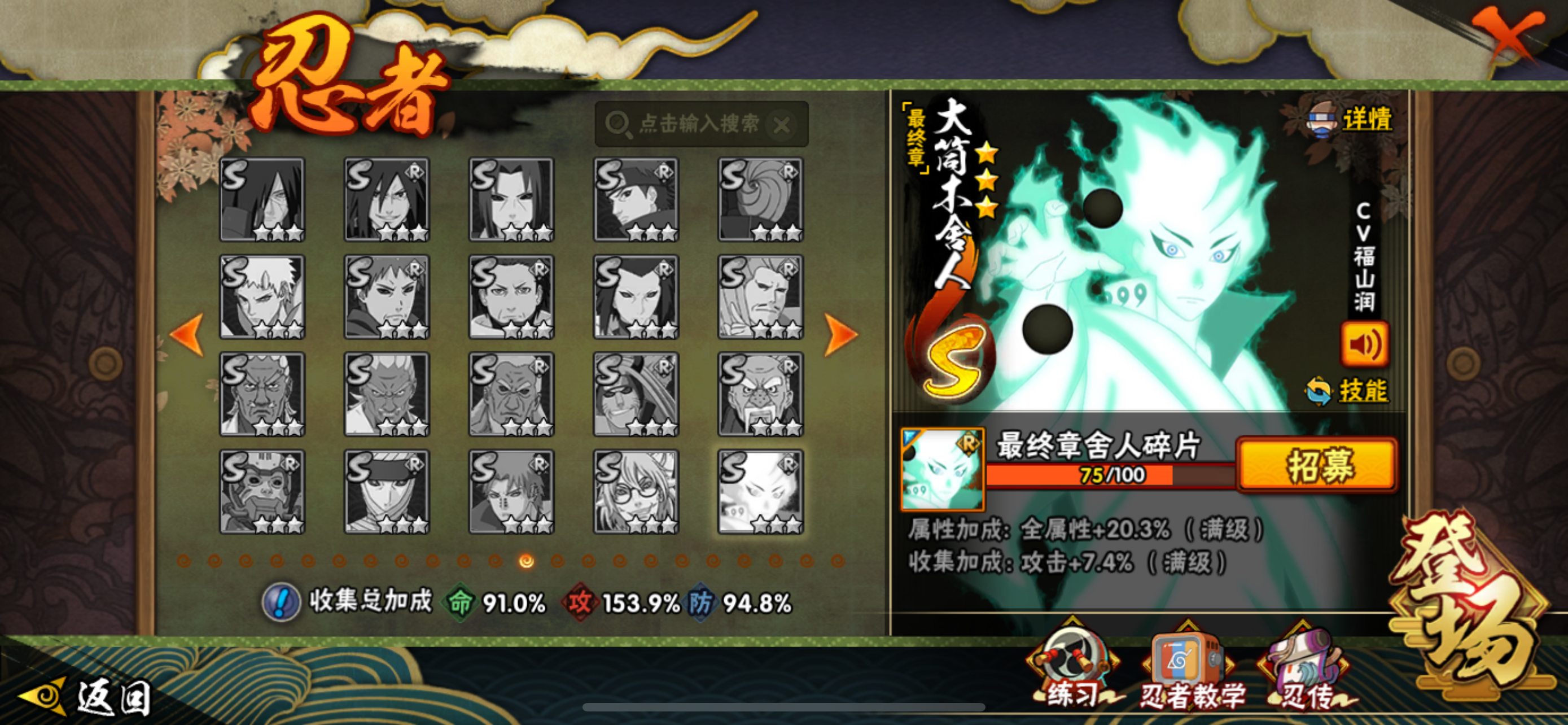 22S级忍者数-35A级忍者数【S级忍者】:长门「秽土转生」(3星),猿飞日
