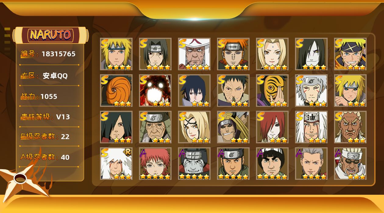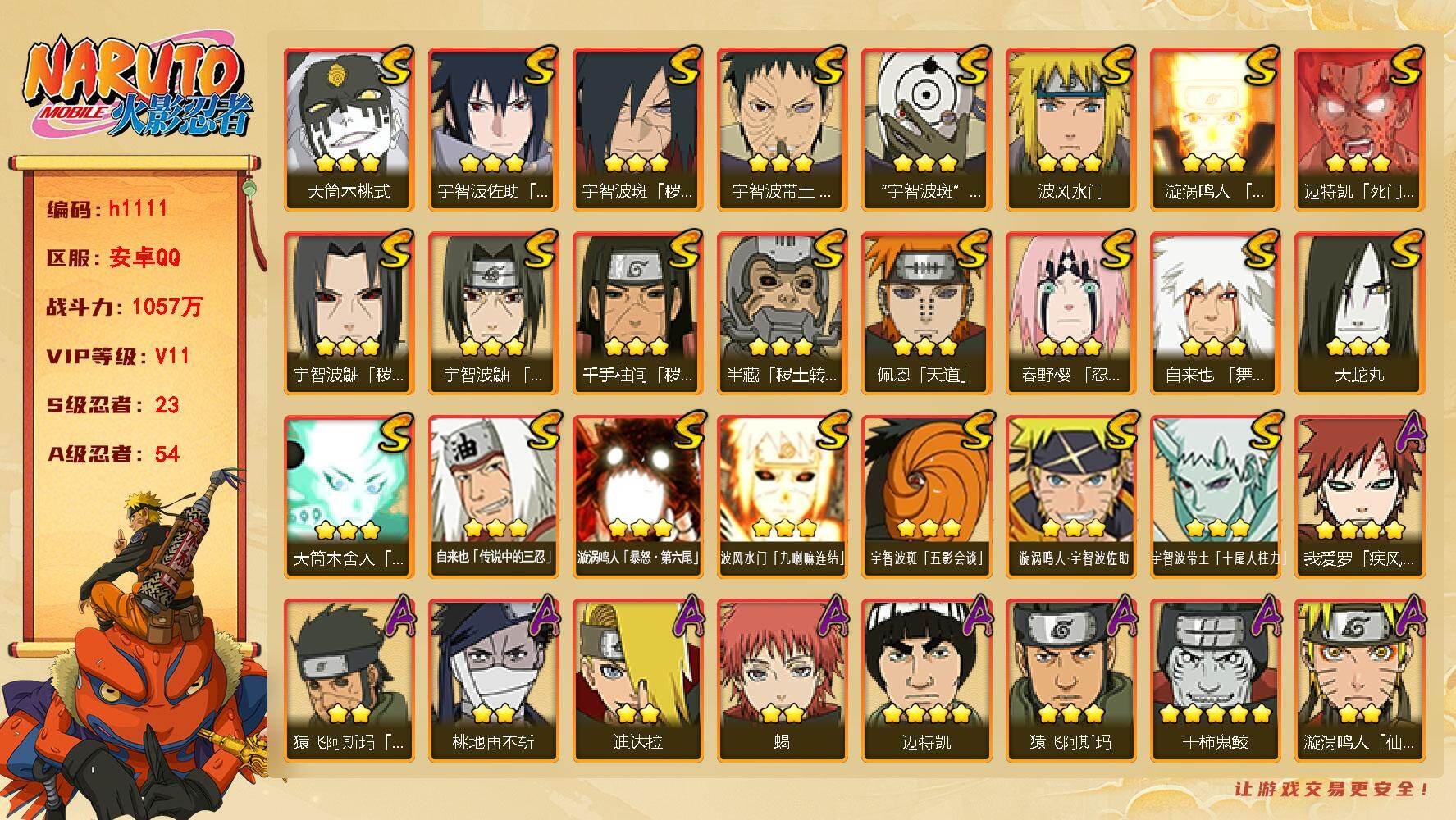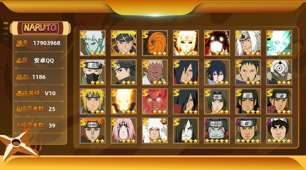 V11,1150万战力,有漂泊带土,再不斩等点卷忍者,可小刀