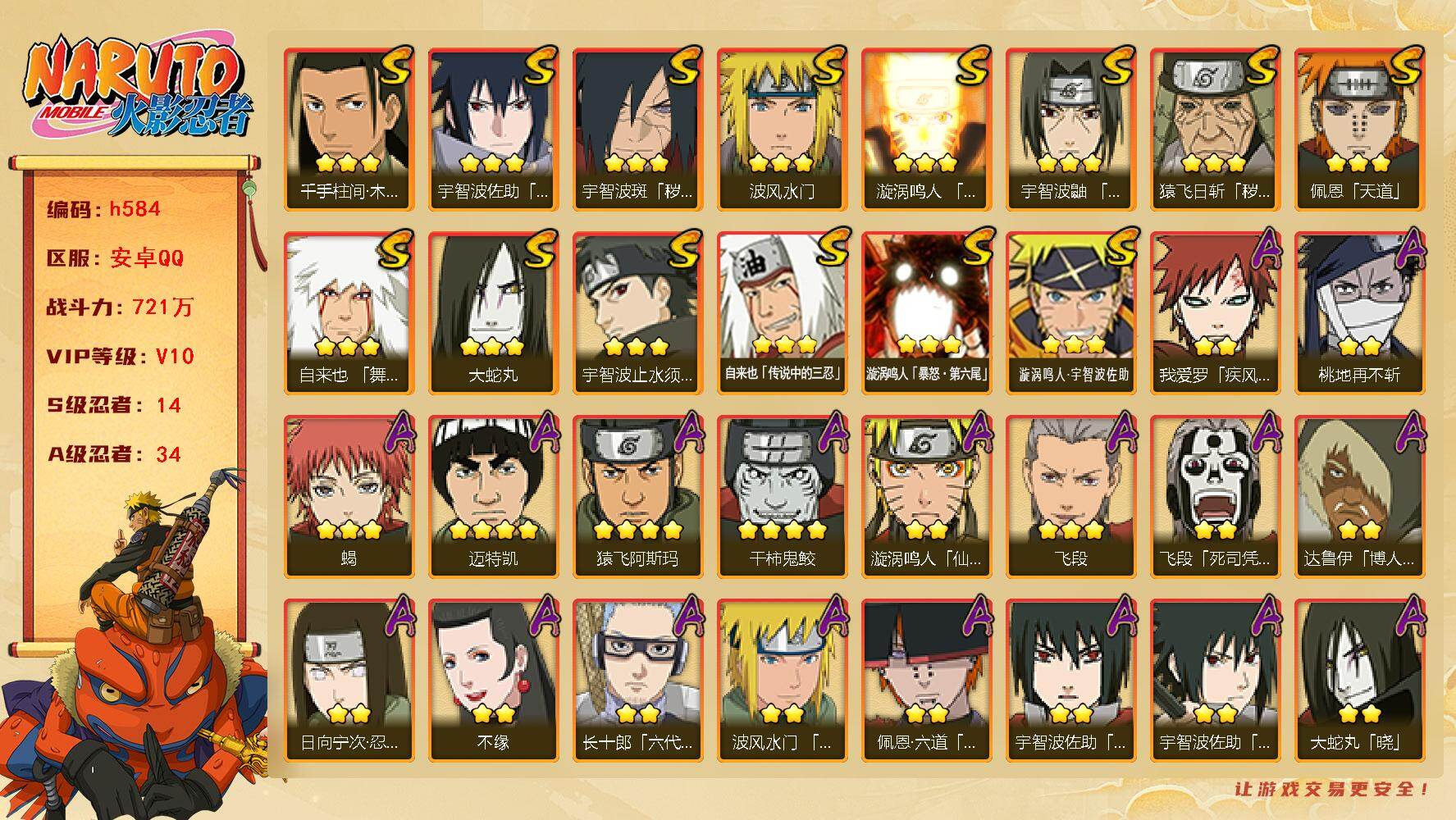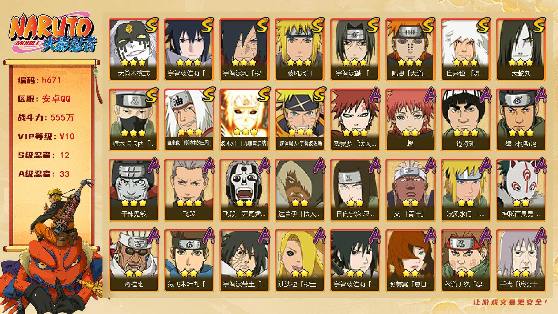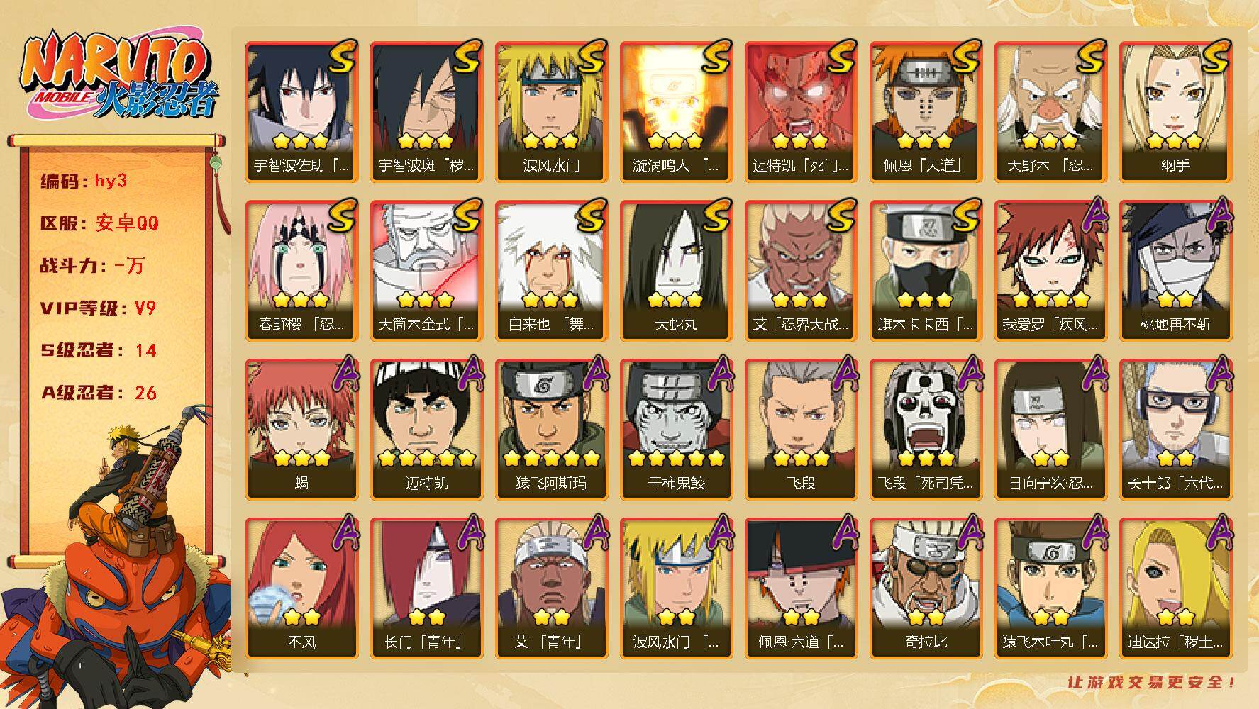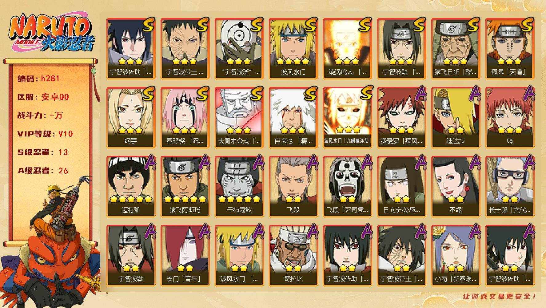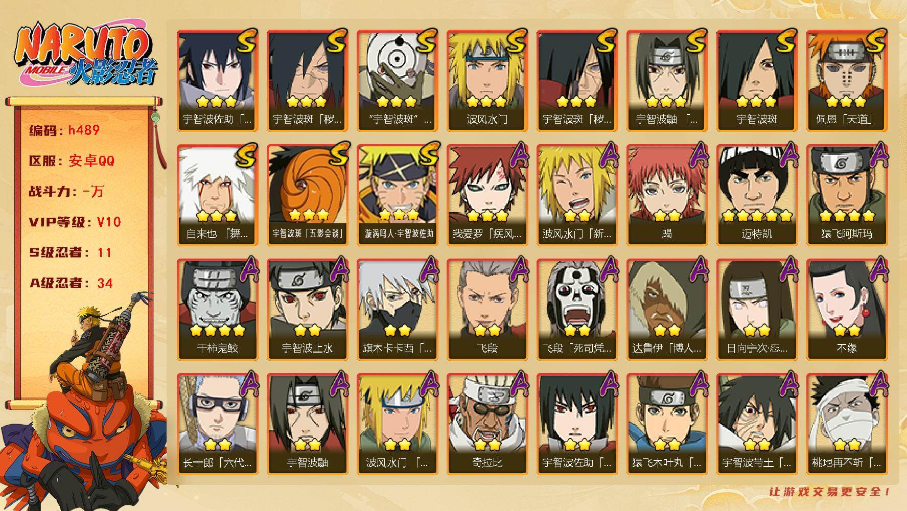 IOS/19S忍/31A忍/战力1252W/V11/区服286 【S忍者】春野樱「忍界大战」,漩涡鸣人「九喇嘛连结」,迈特凯「S门」,千手柱间「秽土转生」,自来也「舞之豪杰」,猿飞日斩「秽土转生」,长门「秽土转生」,宇智波斑,千手柱间,艾「四代目雷影」,千手扉间,神秘面具男,宇智波鼬「须佐能乎」,佩恩「天道」,猿飞日斩,波风水门,大蛇丸,自来也,纲手, 【A