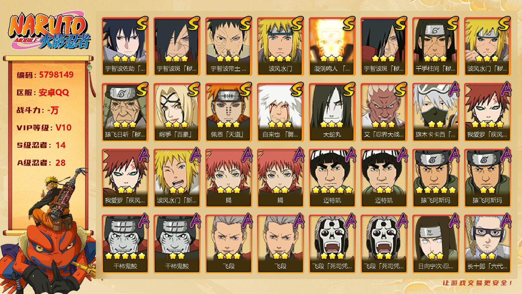 IOS/15S忍/31A忍/战力793W/V11/区服710 【S忍者】宇智波止水「须佐能乎」,艾「忍界大战」,千手柱间「木叶创立」,宇智波佐助「永恒万花筒」,宇智波带土「忍界大战」,千手柱间「秽土转生」,自来也「舞之豪杰」,大筒木舍人「最终章」,漩涡鸣人「暴怒·第六尾」,宇智波鼬「秽土转生」,千手扉间「秽土转生」,宇智波鼬「须佐能乎」,佩恩「天道」,波风水