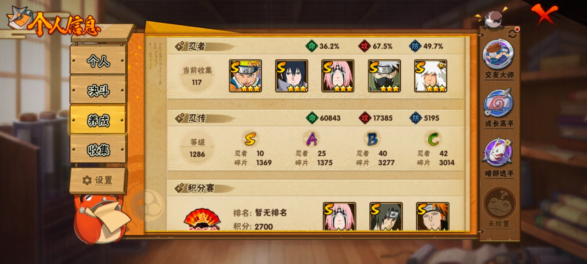 实名: 包人脸 贵族等级: V9 S忍数: 12 A忍数: 22 S级忍者: 佩