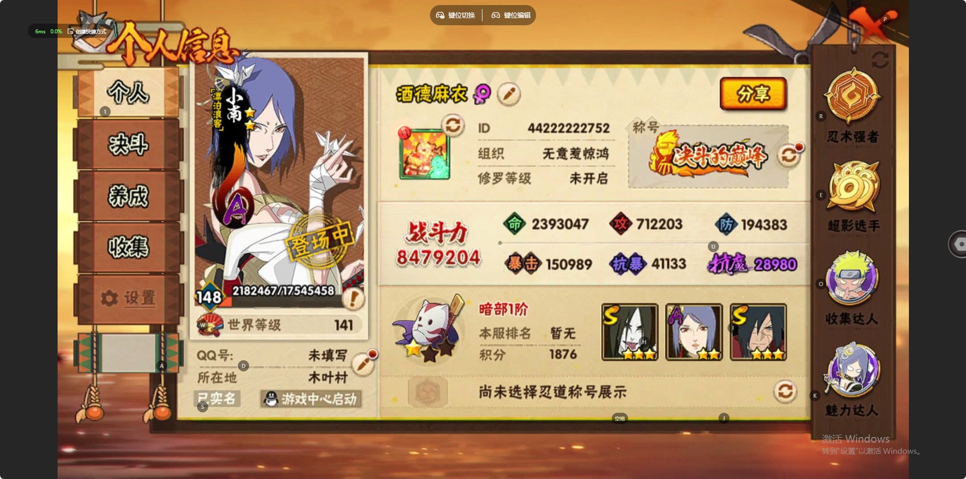 角色等级149 战斗力10498024 S忍33 A忍49 12 段位暗部
