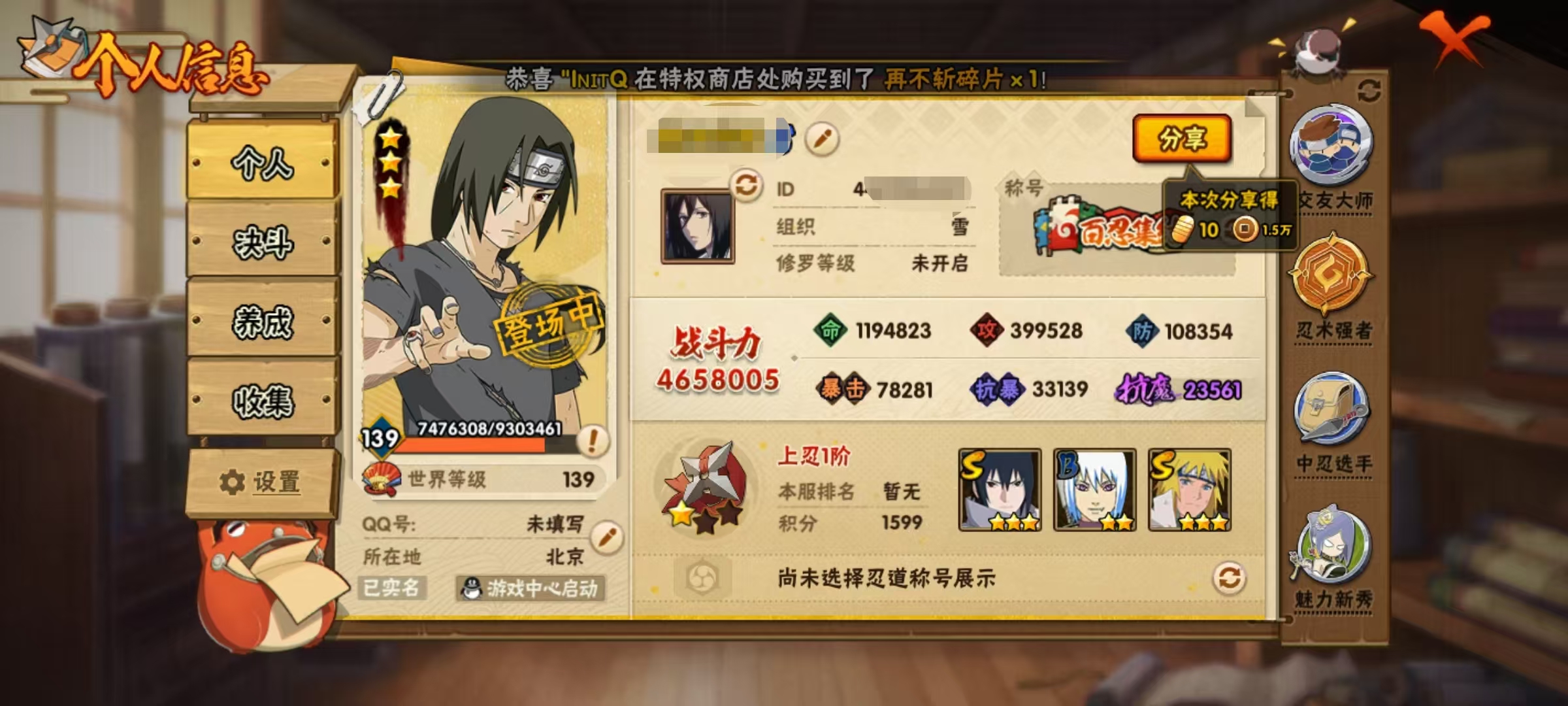 安卓qq 可二次/v12/成品超哥号/一千三百万战力/S忍