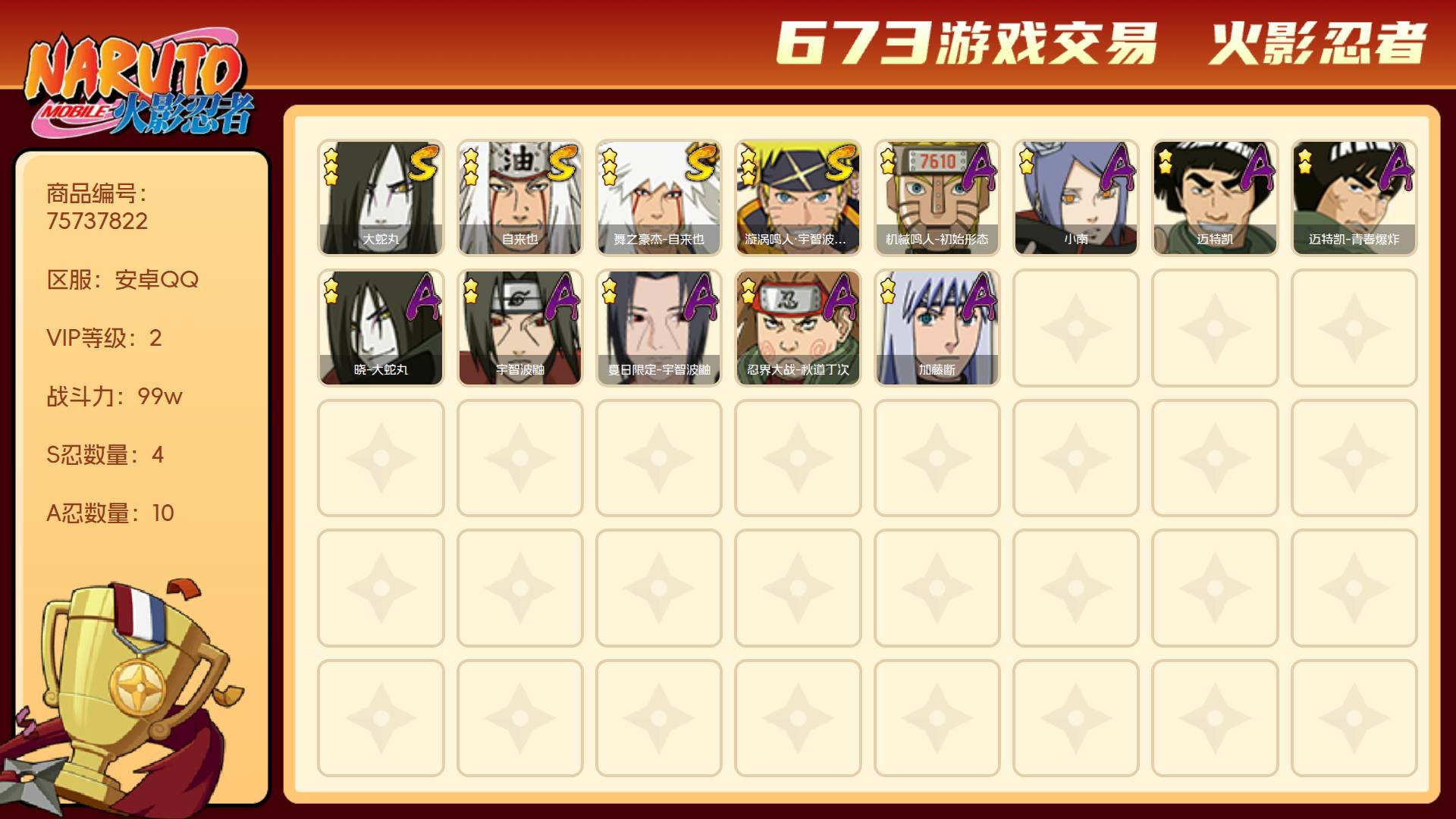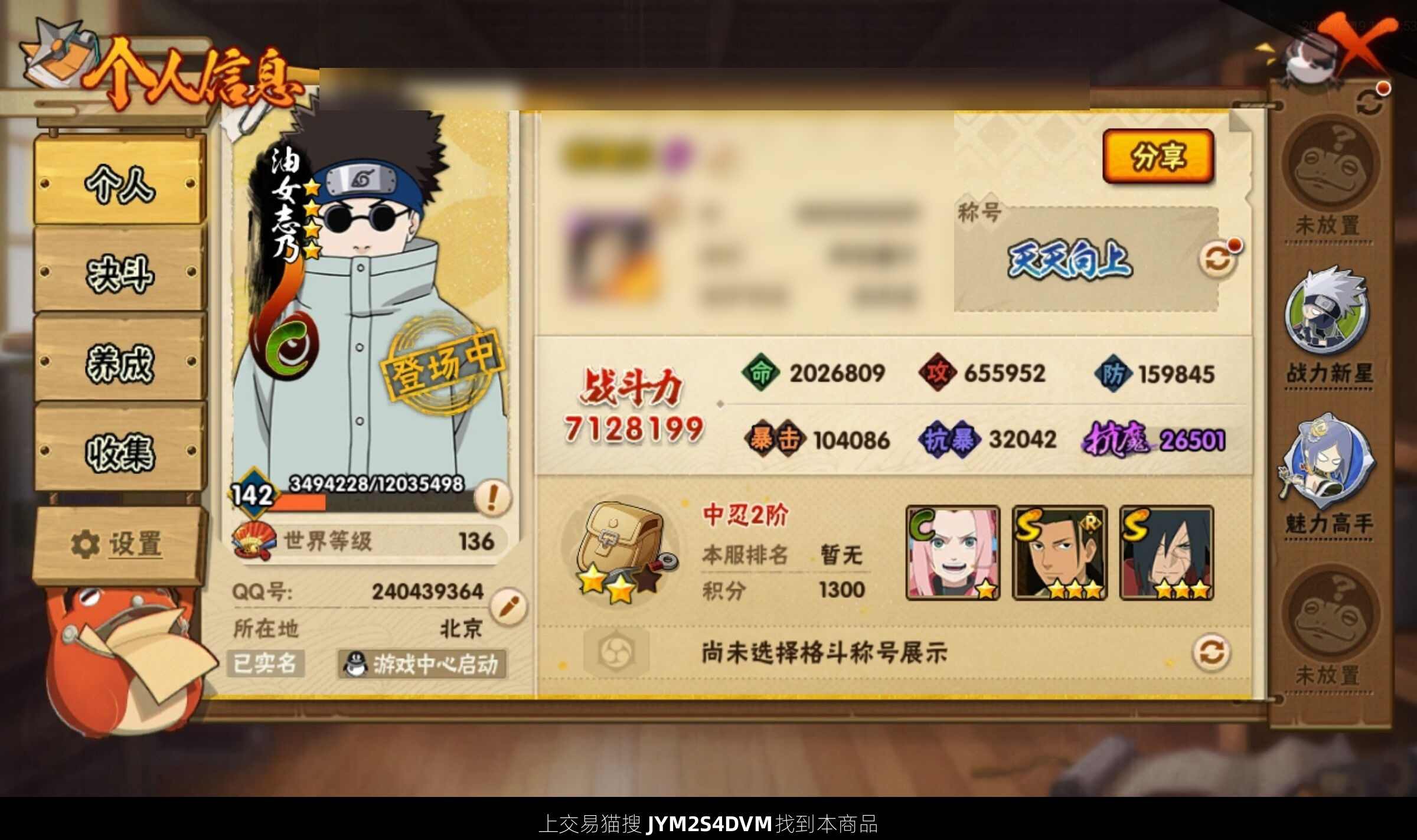 角色等级83 金币2000十 战斗力99w S忍4 A忍10 5星S忍者O 2 段位影级