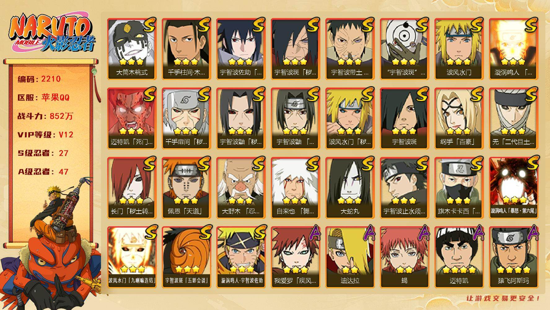 V12 852万战力 27S-47A 传说自来也65片 十尾带土64片 舍人8