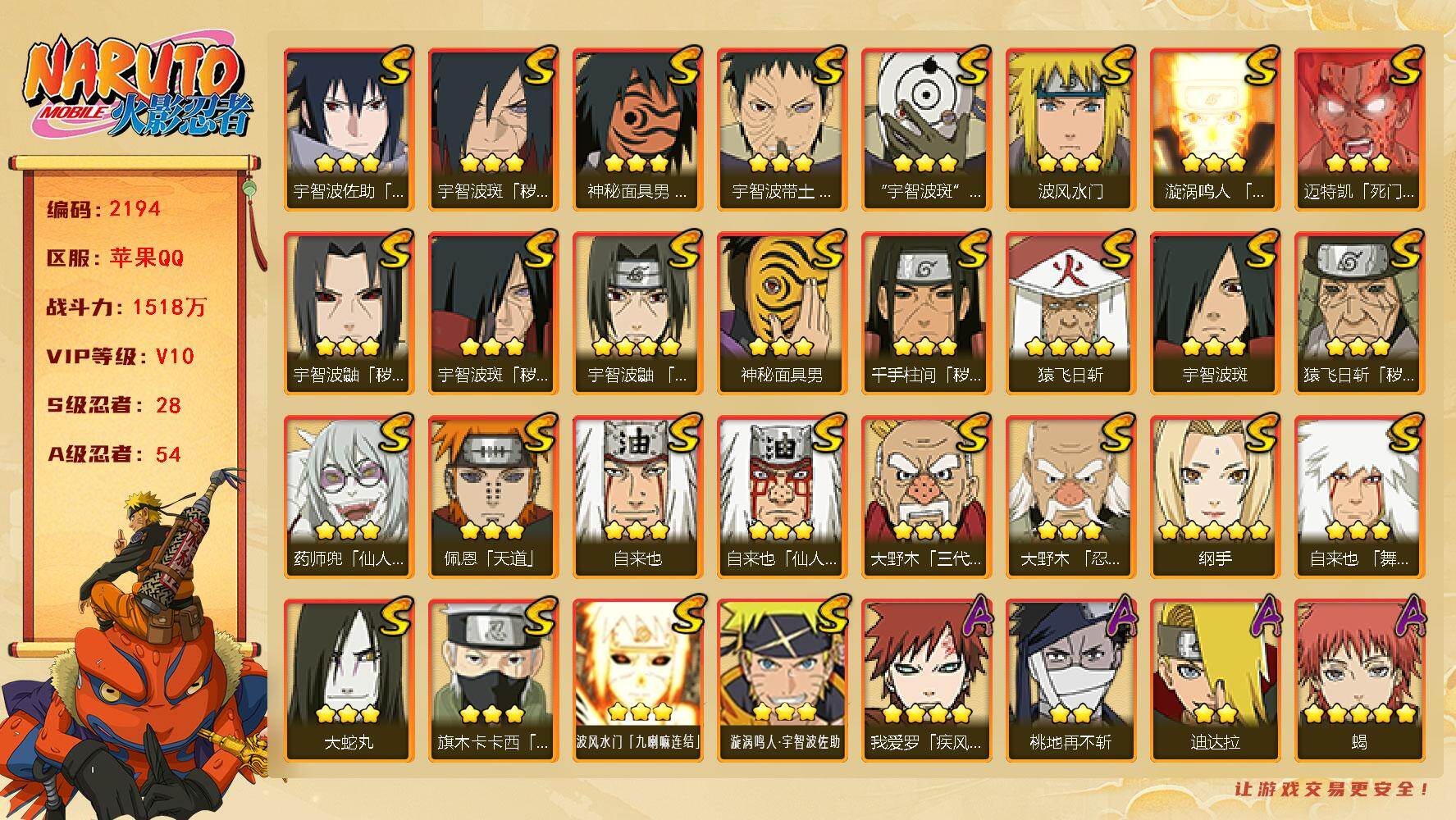 V10 1518万战力 28S-54A 有熊猫 传说自来也80片 十尾带土56