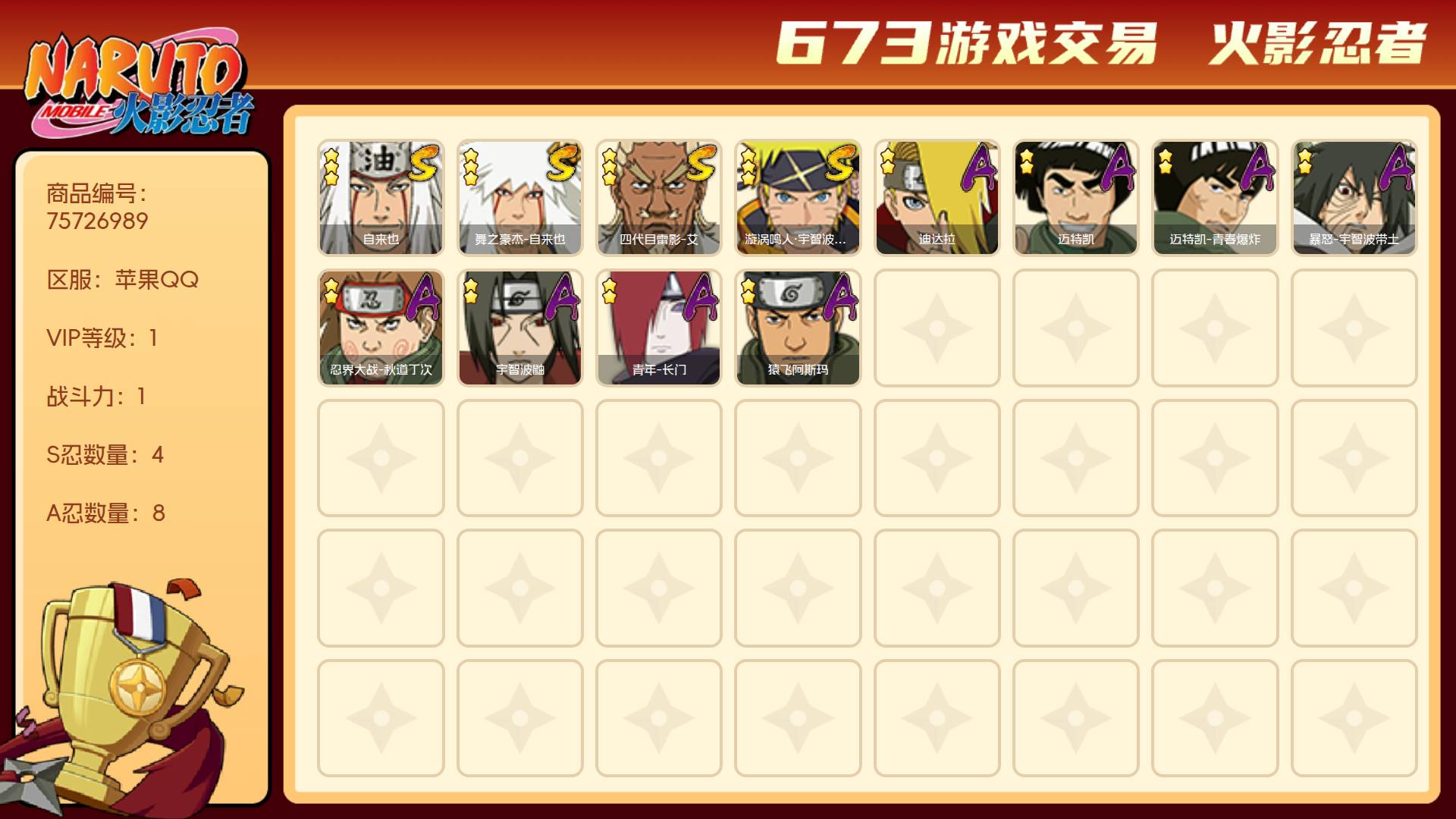 角色等级96 金币1 战斗力1 S忍4 A忍8 5星S忍者1 1