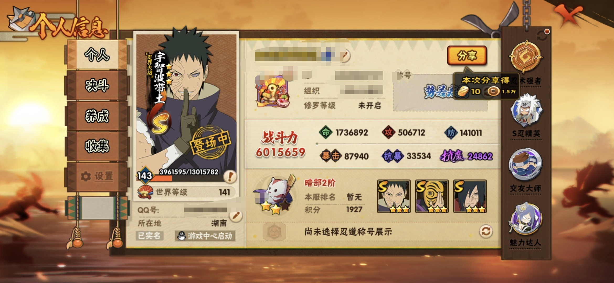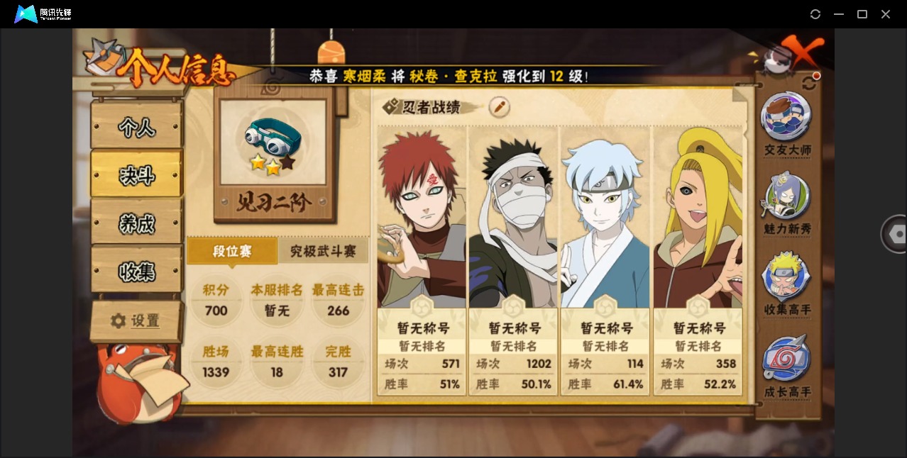 角色等级165 战斗力2400w+ S忍53 A忍86 14 段位见习