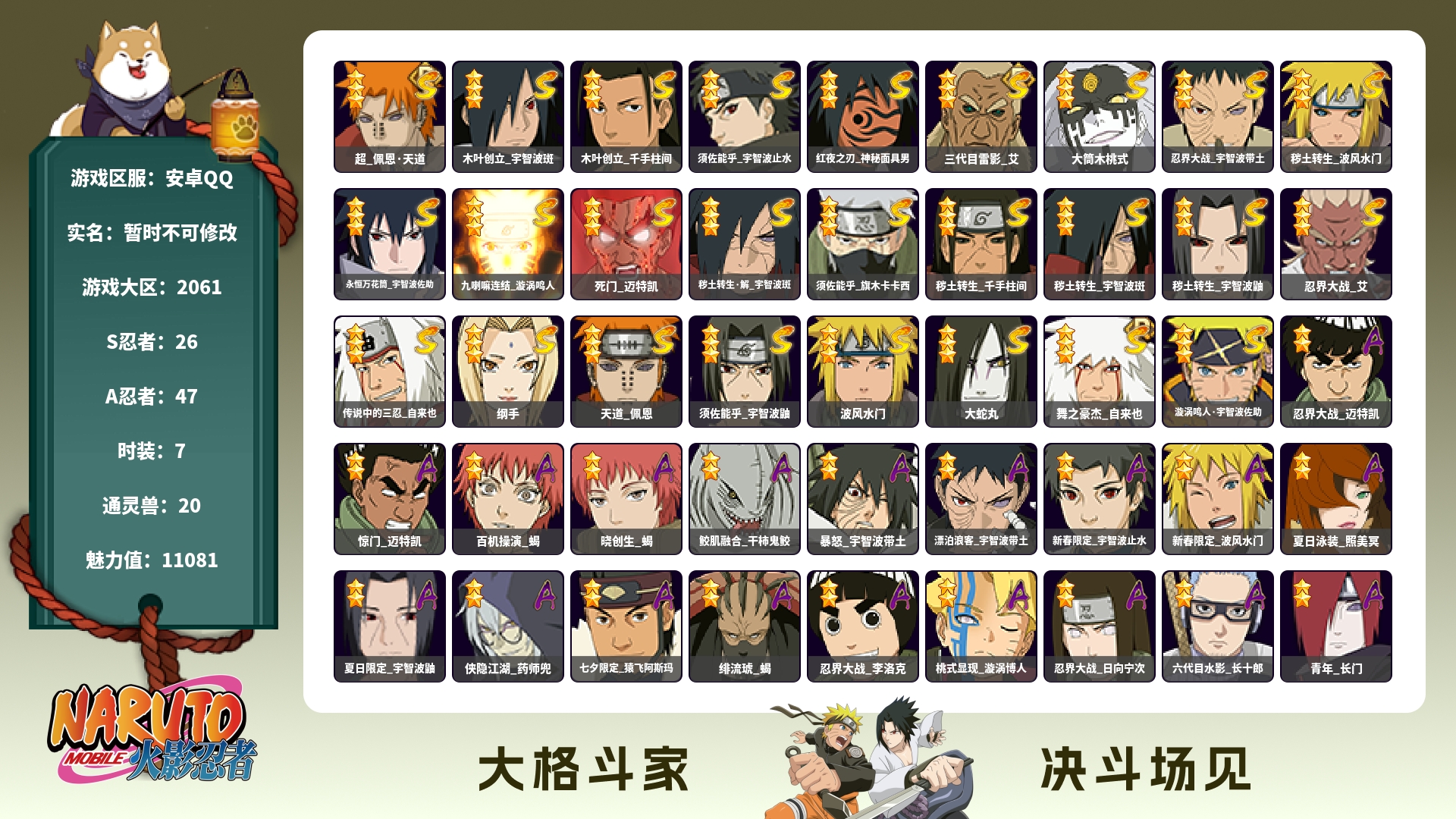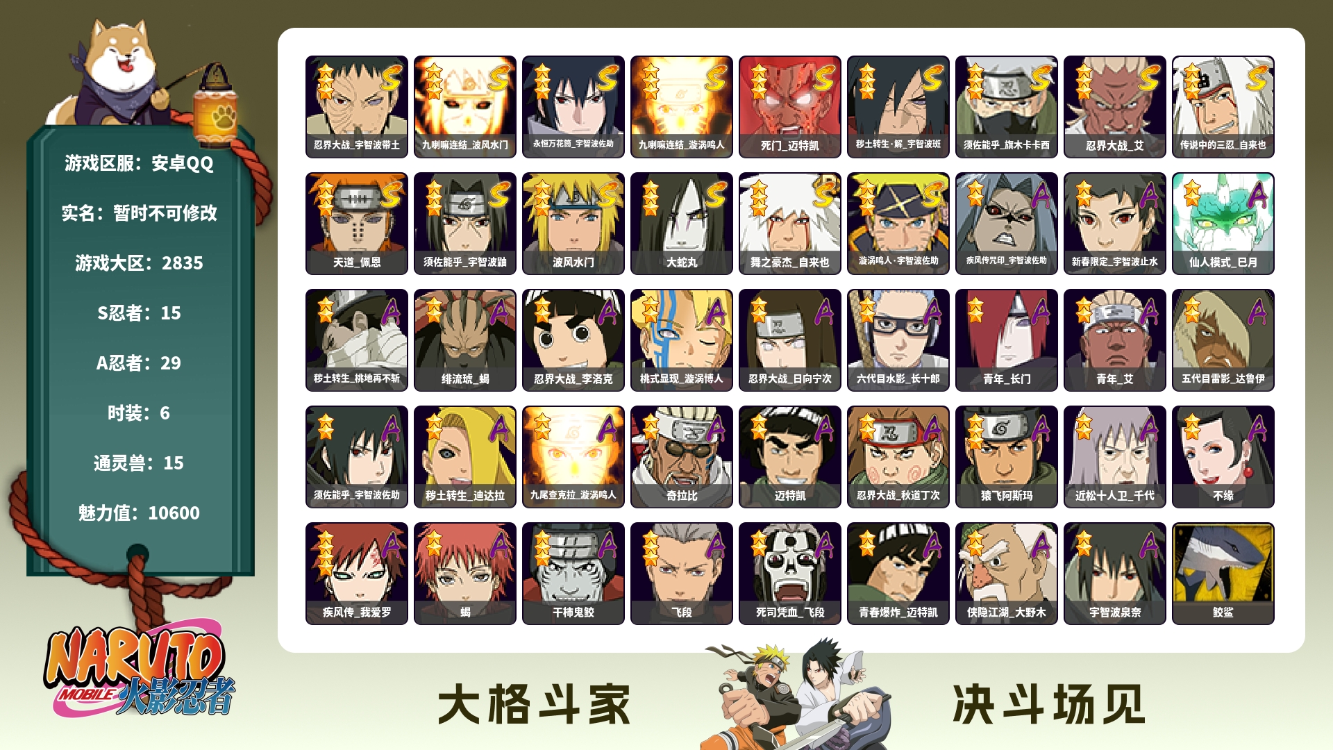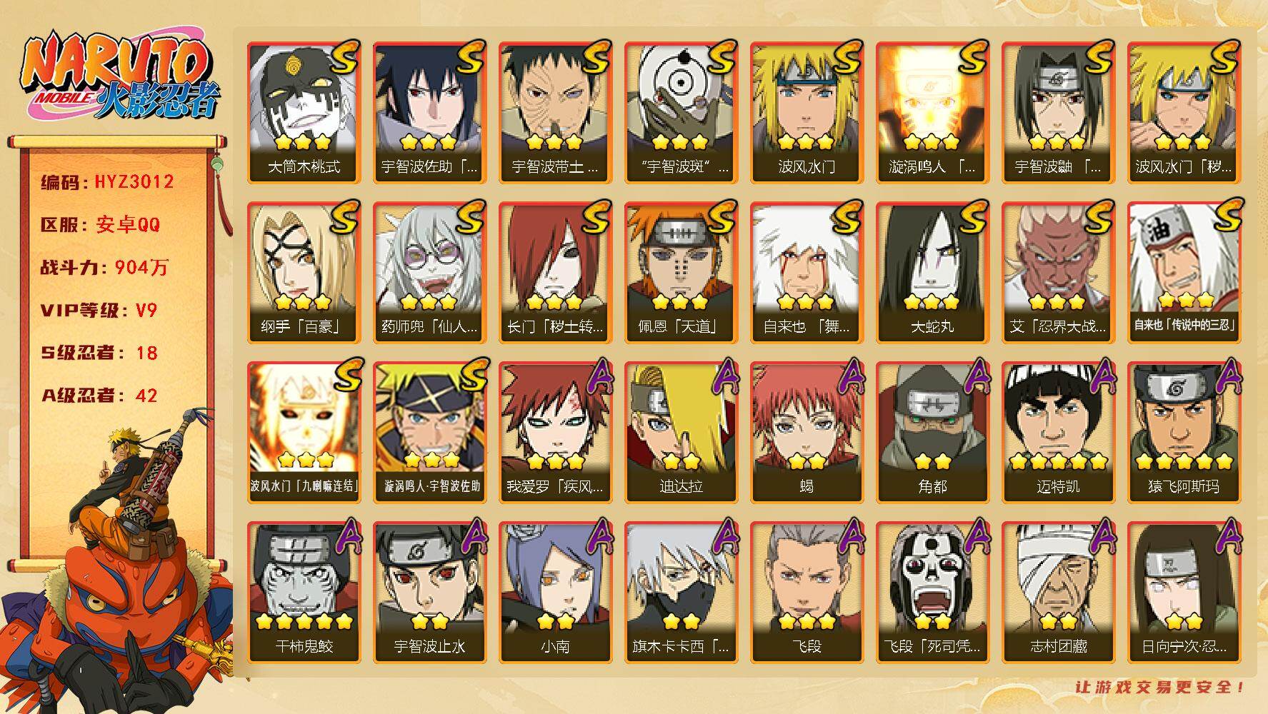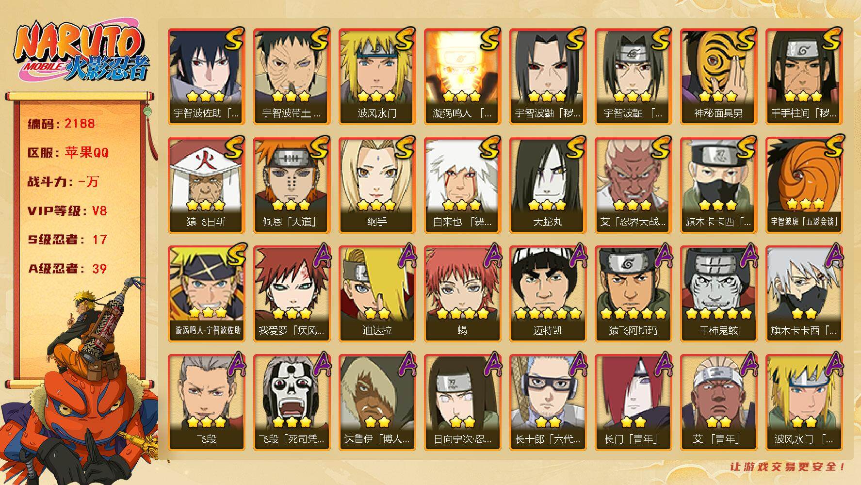 【漩涡鸣人九喇嘛 秽土斑 秽土柱间 带土 熊猫PVP号】15S级忍者数-32A
