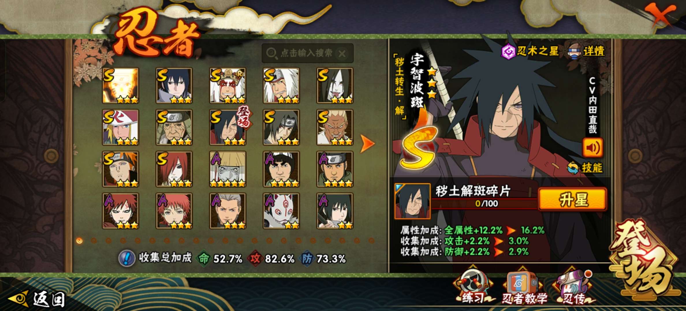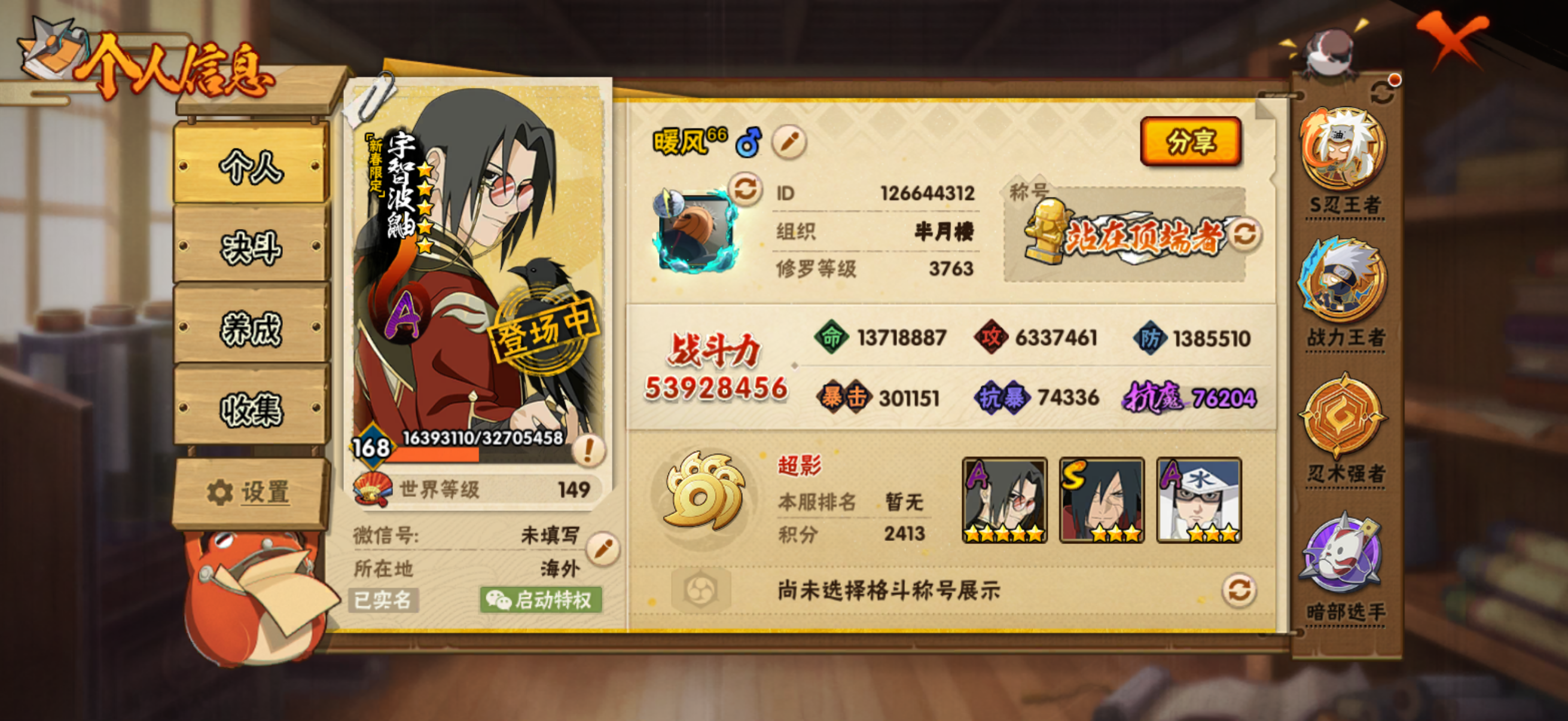 9S忍/25A忍/战力569W/V6/区服3111 【S忍者】宇智波斑「秽土转生·解」,宇智波佐助「永恒万花筒」