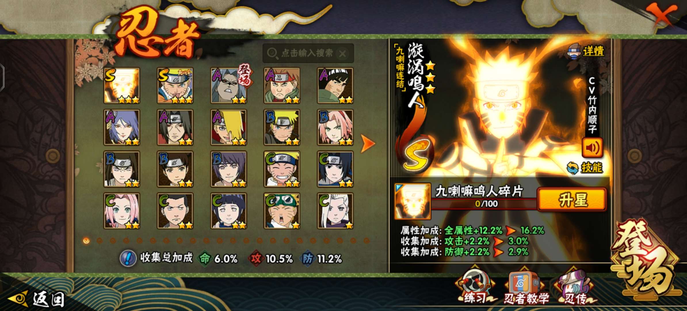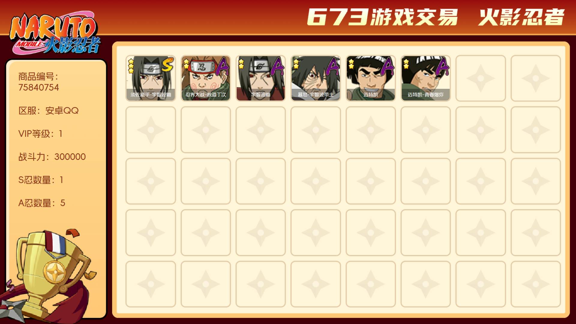 角色等级79 金币3000 战斗力300000 S忍1 A忍5 1
