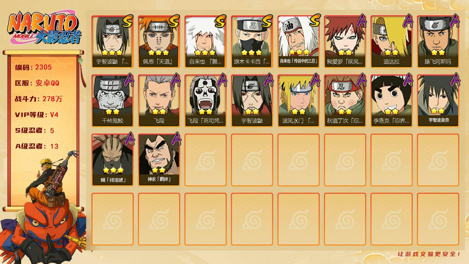 5S忍/20A忍/战力326W/V5/区服4287 【S忍者】宇智波佐助「漩涡鸣人」,自来也「舞之豪杰」