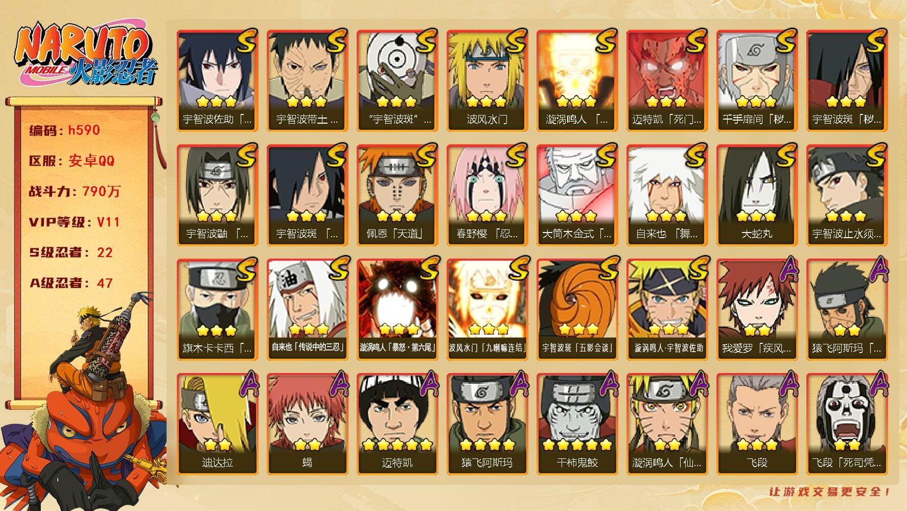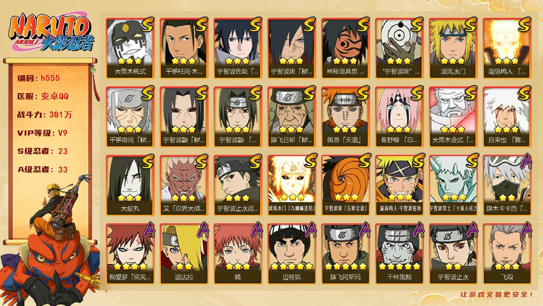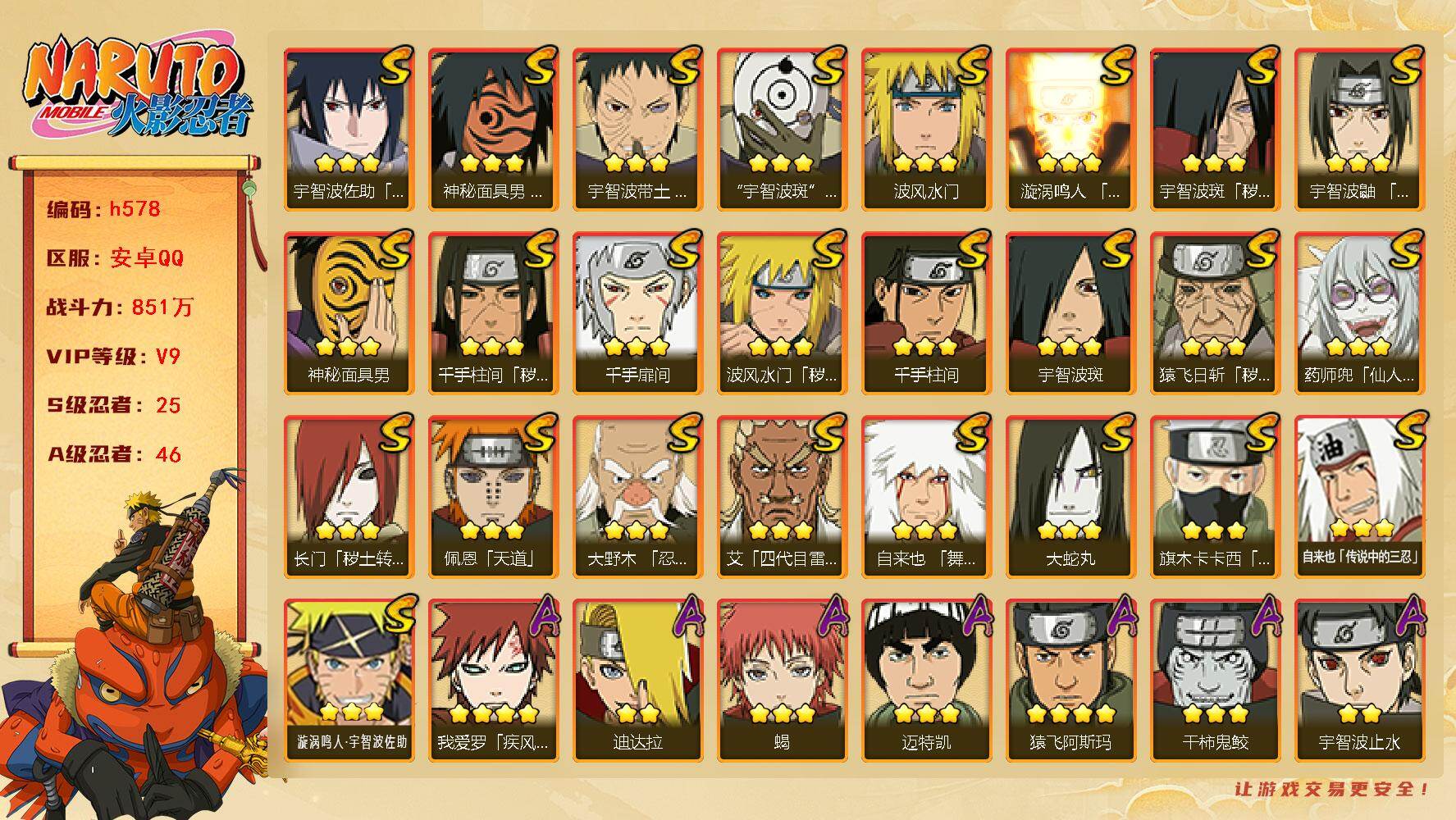 VIP9,851W战力,S忍25个,A忍46个,金银角98片,带土59片,创立