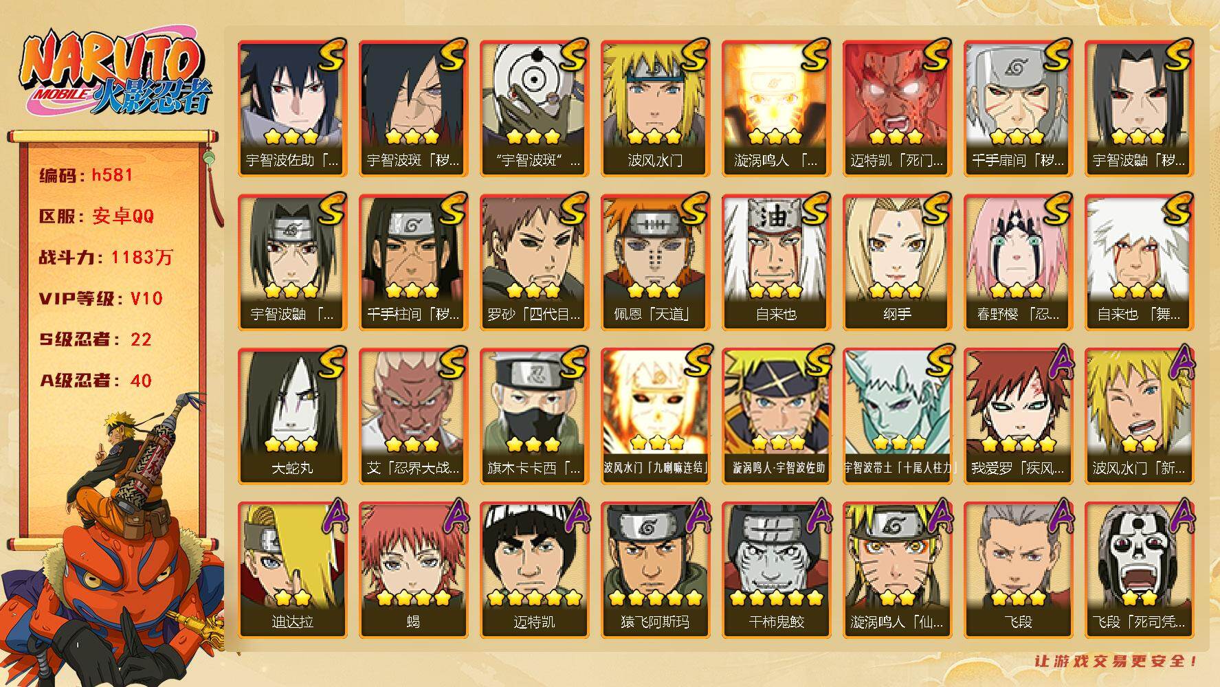 v10,1183万战力,22s,40a,三代97片,创立柱间80片,止水80片,