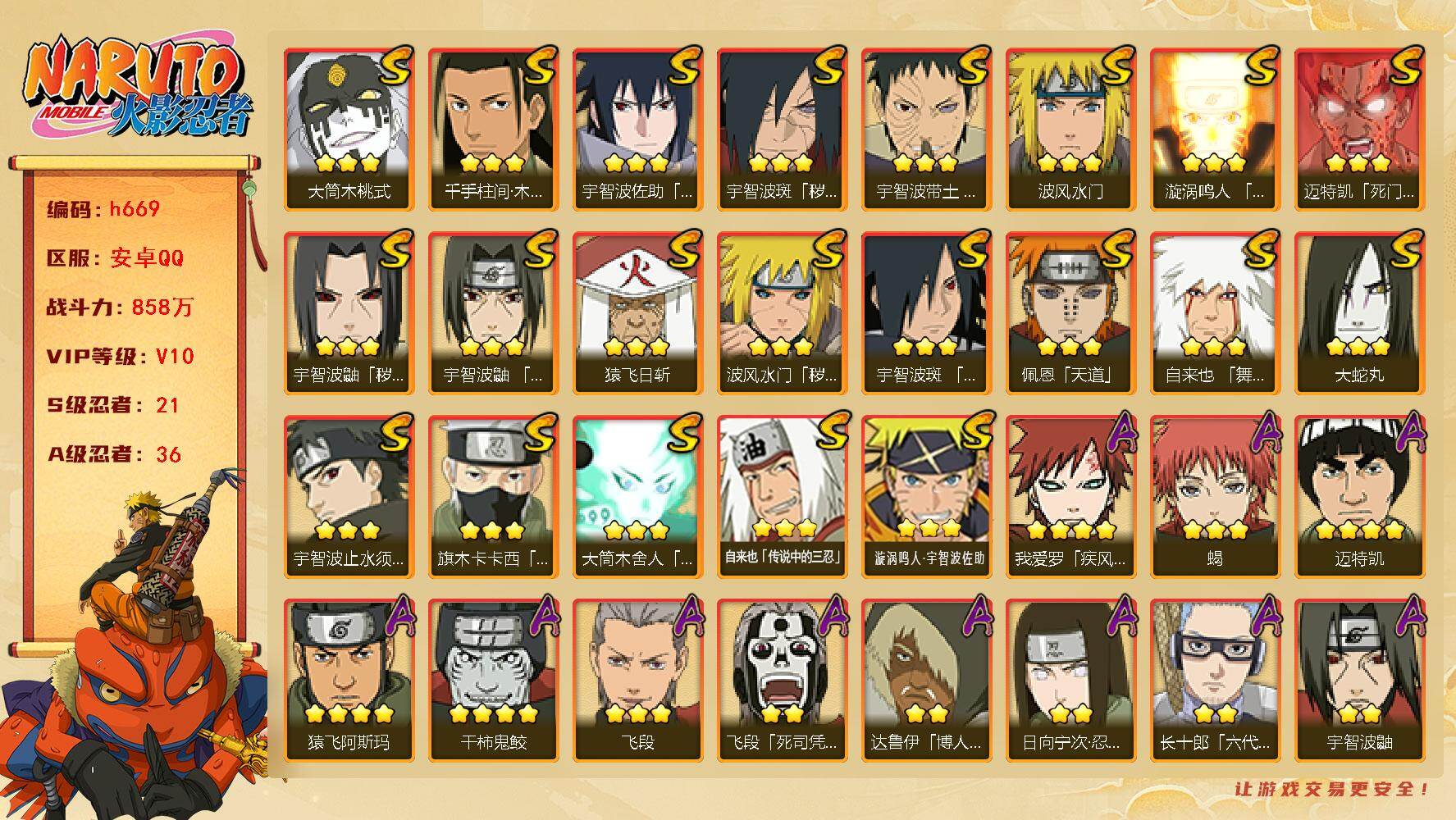 V9 865万战力 21S-34A 红叶面具男80片 止水65片 舍人60片