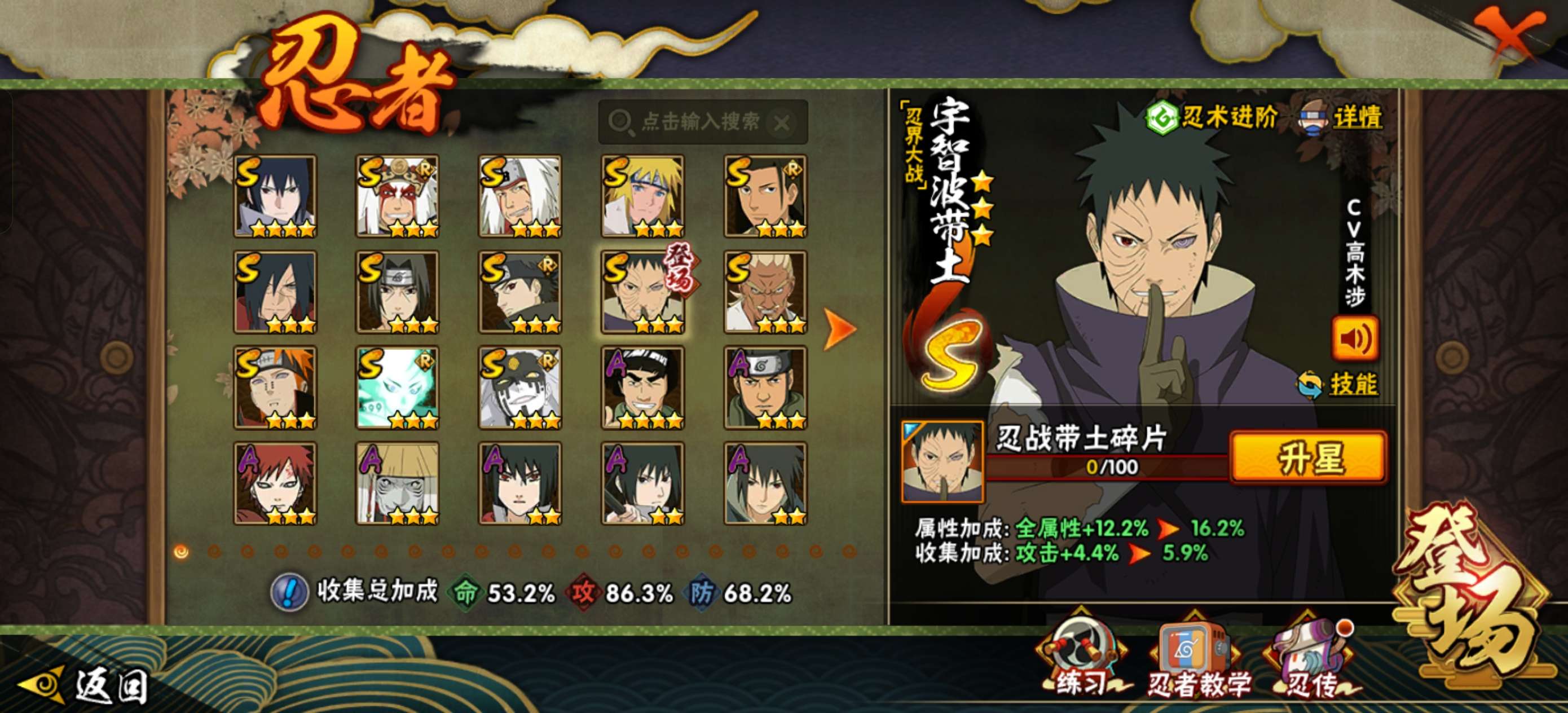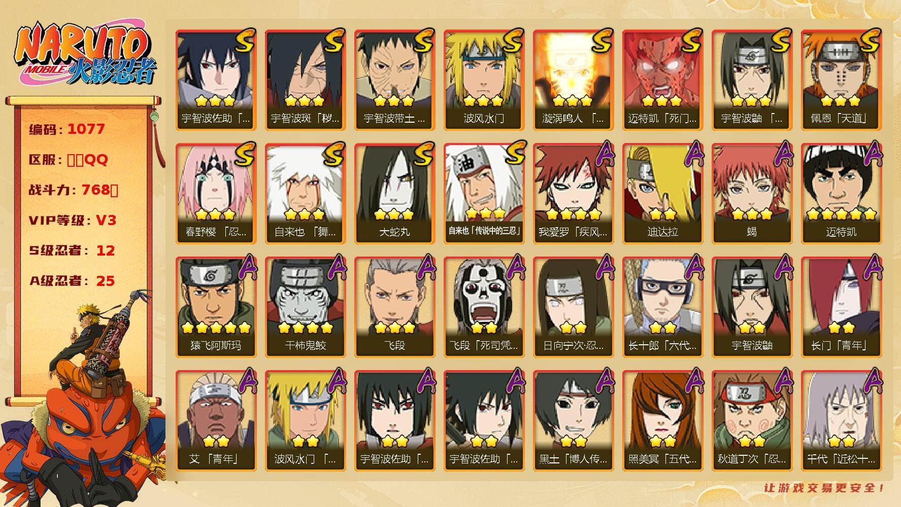 火影忍者【安卓QQ】V3 12S 25A 768W战力 金币17000 忍者艾80片 忍者大野木8