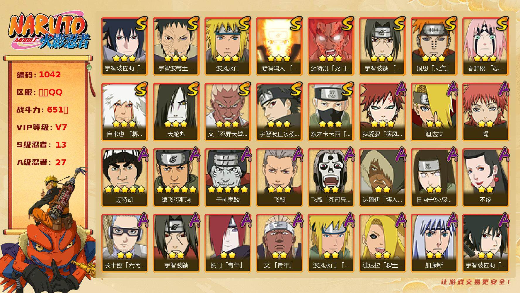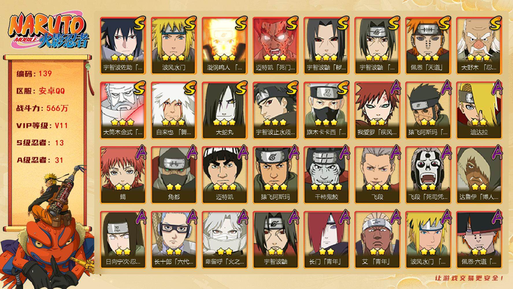 火影忍者【安卓QQ】V11,13S,31A,566W战力,有漂泊六道、新春小南、漂泊带土、侠隐大野