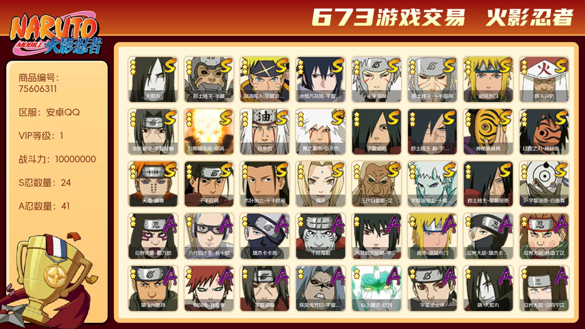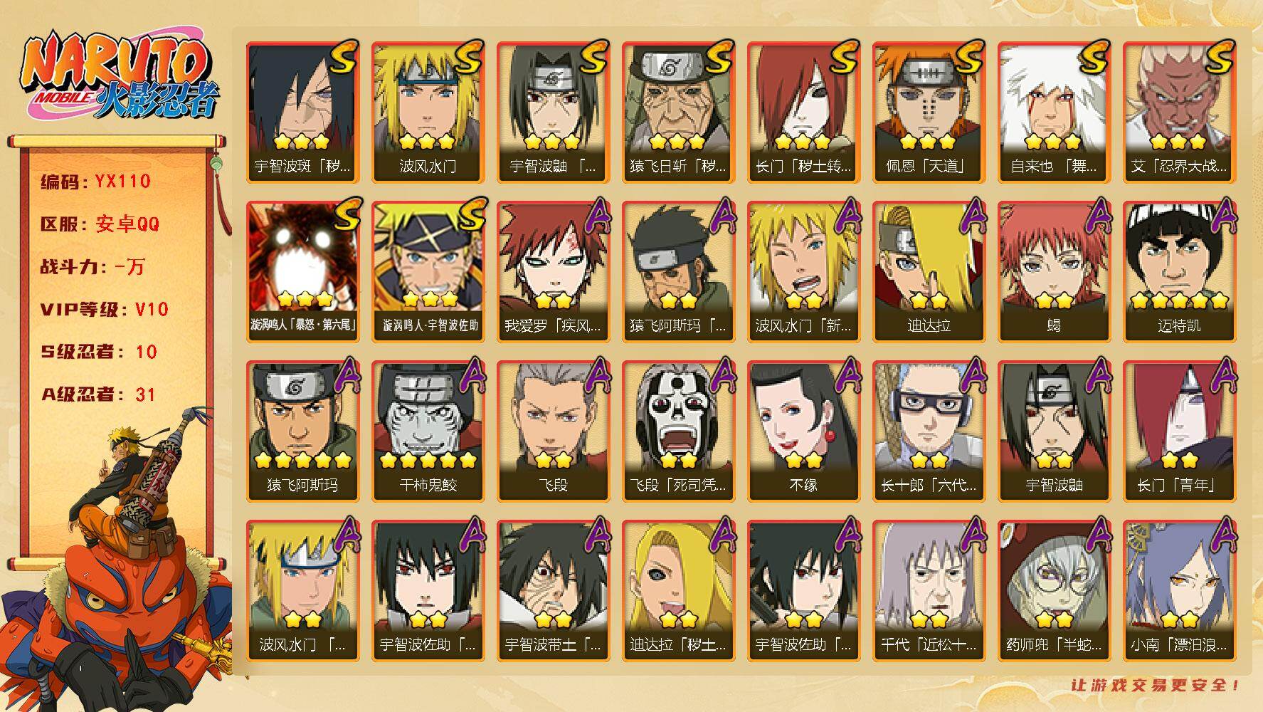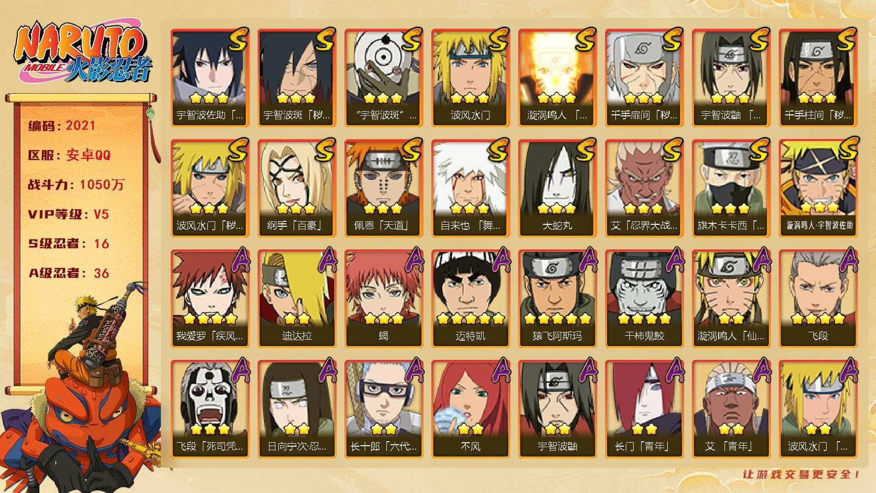 (可免费转苹果)v5,1050w战力,16S级忍者数-36A级忍者数,传说自来
