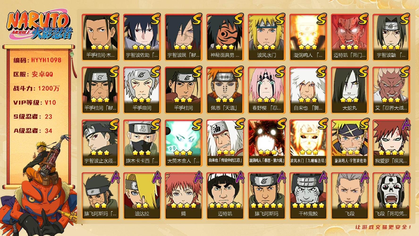 V10/战力1200W/S忍23/A忍34/2星大野木「侠隐江湖」/3星波风水门「九喇嘛连结」