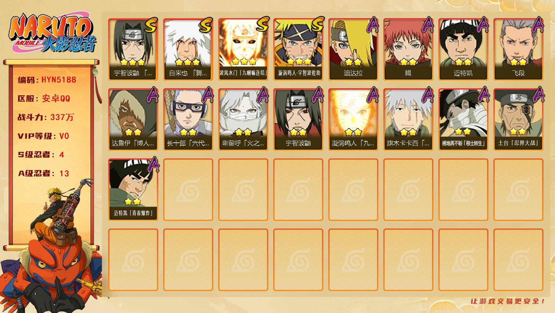 (可免费转苹果)v5,1050w战力,16S级忍者数-36A级忍者数,传说自来