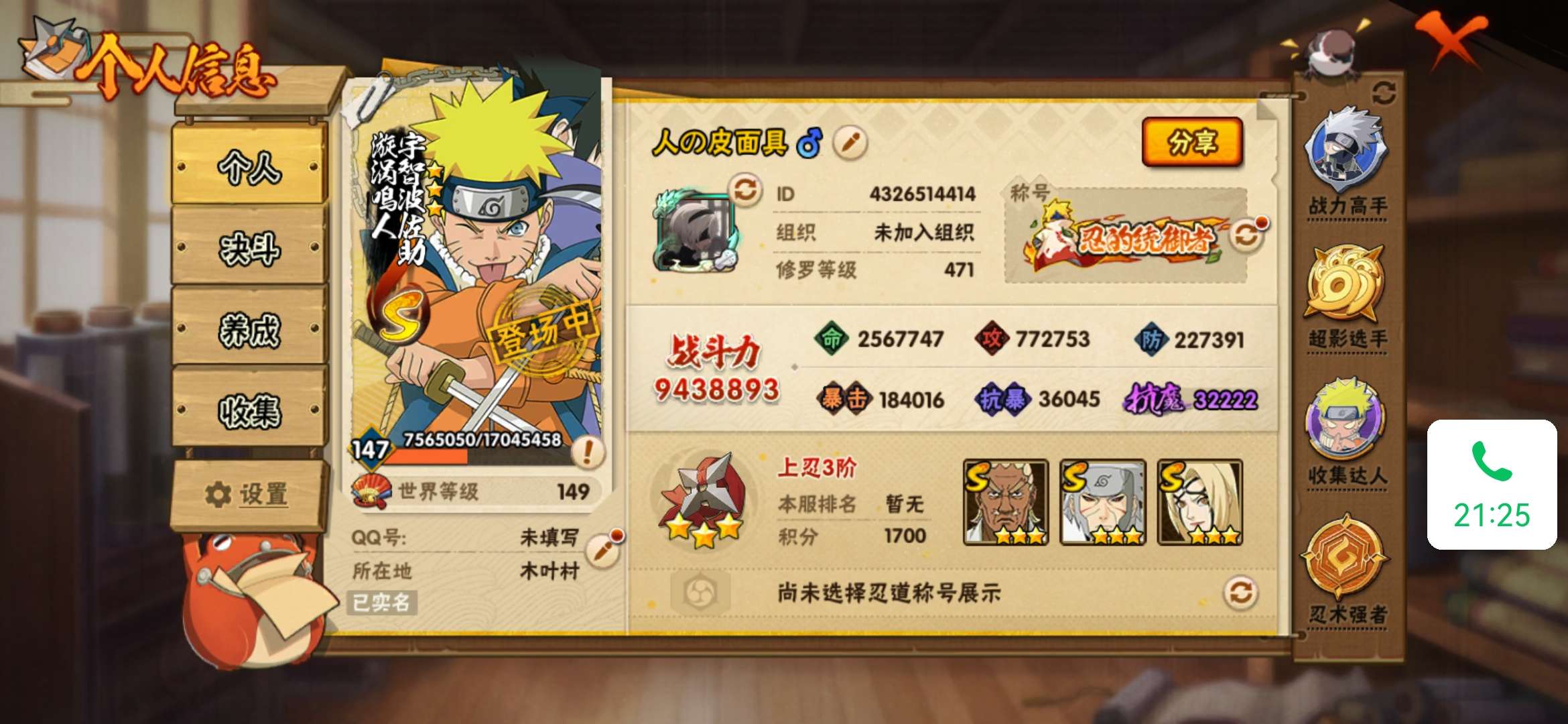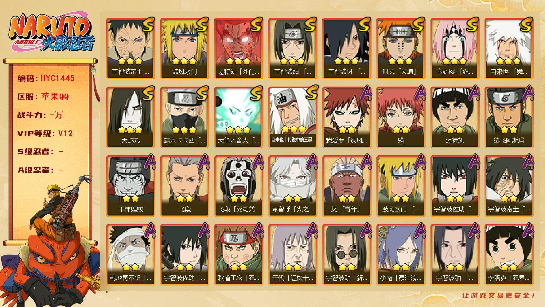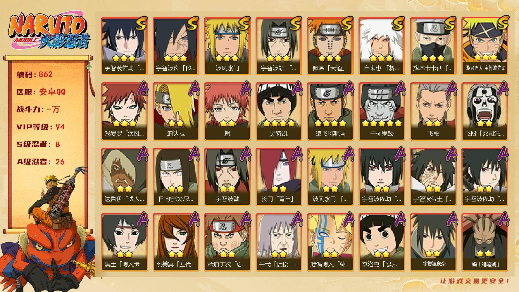【4S+金币】豪杰自来也s+百战水门s+佩恩s+解班s+忍战宁次A +3W金币