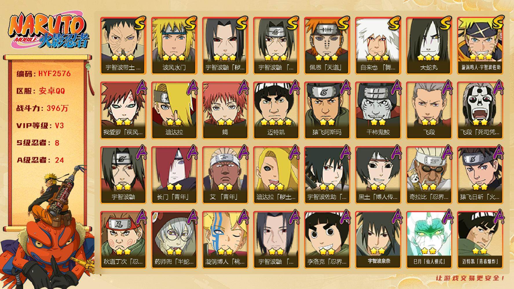 V3/战力396W/S忍8/A忍24/疾风传-我爱罗/死司凭血-飞段