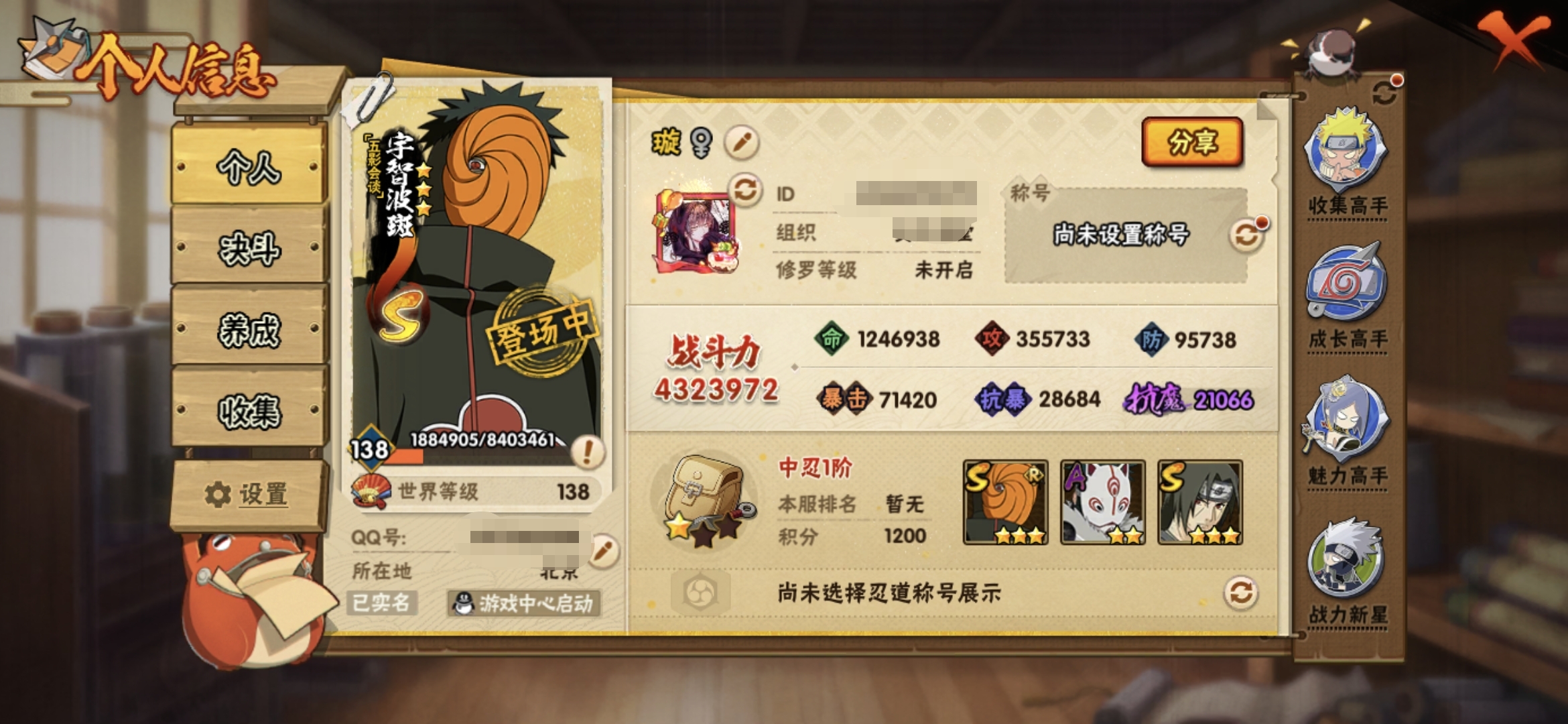 V6/战力310W/S忍4/A忍9/舞之豪杰-自来也/3星宇智波带土「十尾人柱力」