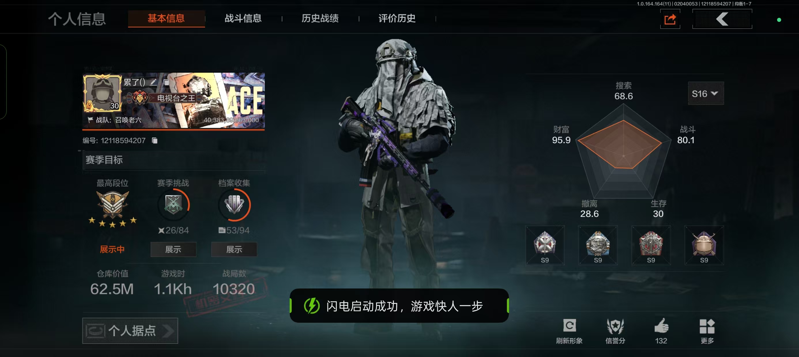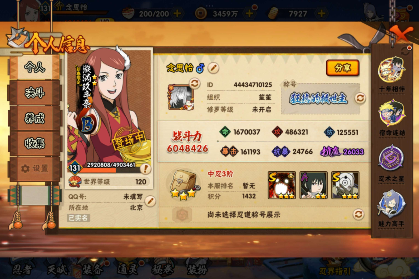 角色等级93 金币18000 战斗力2120000 S忍4 A忍9 5 段位上忍