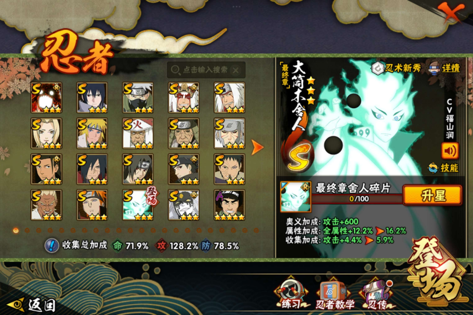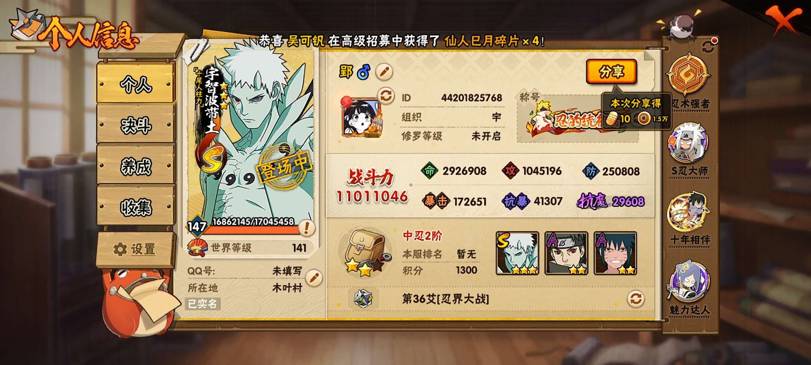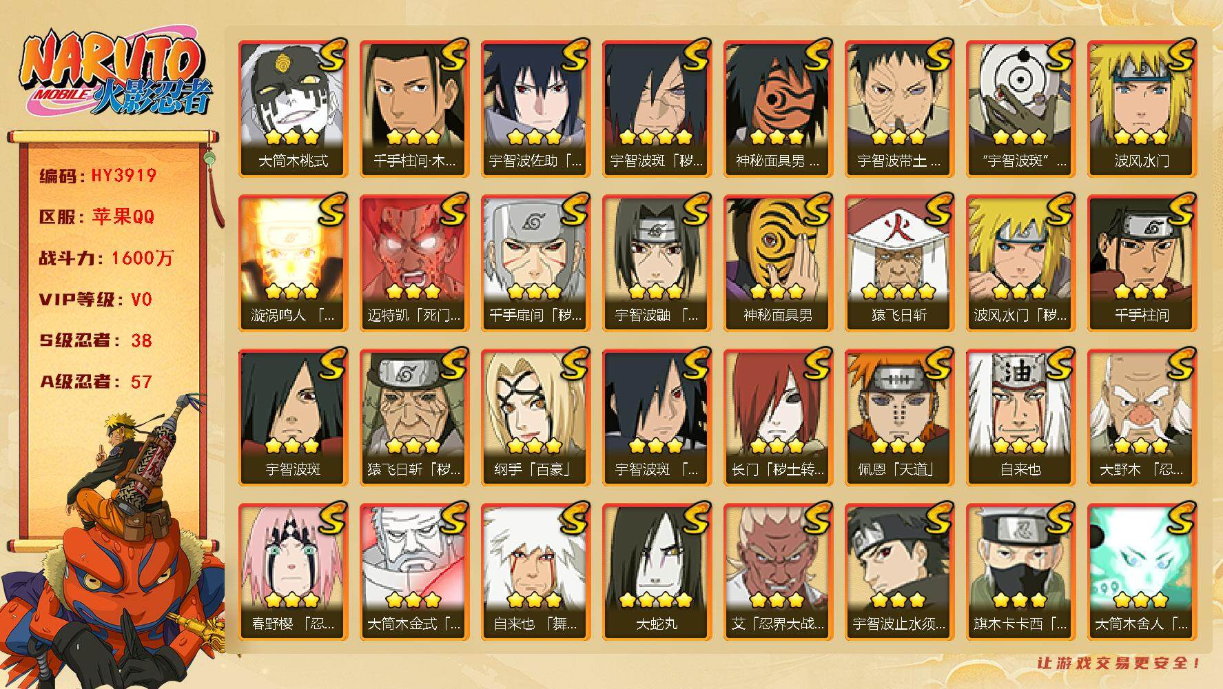 V0/战力1600W/S忍38/A忍57/百豪-纲手/2星大野木「侠隐江湖」