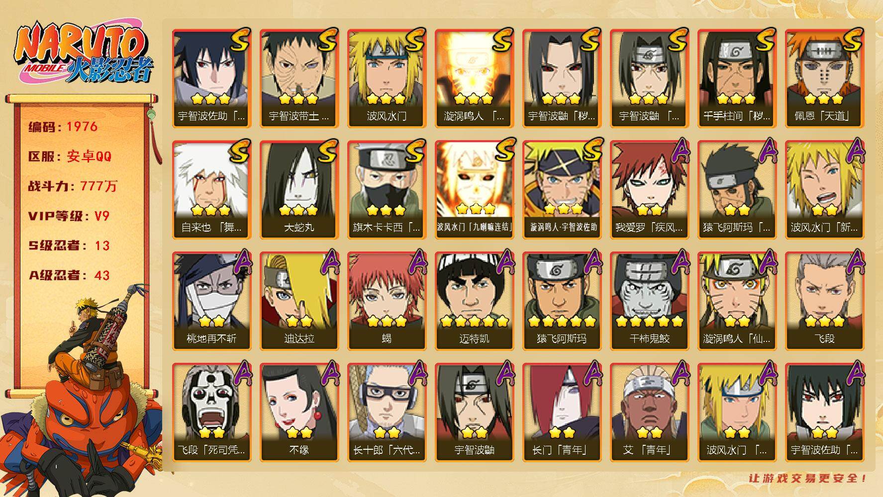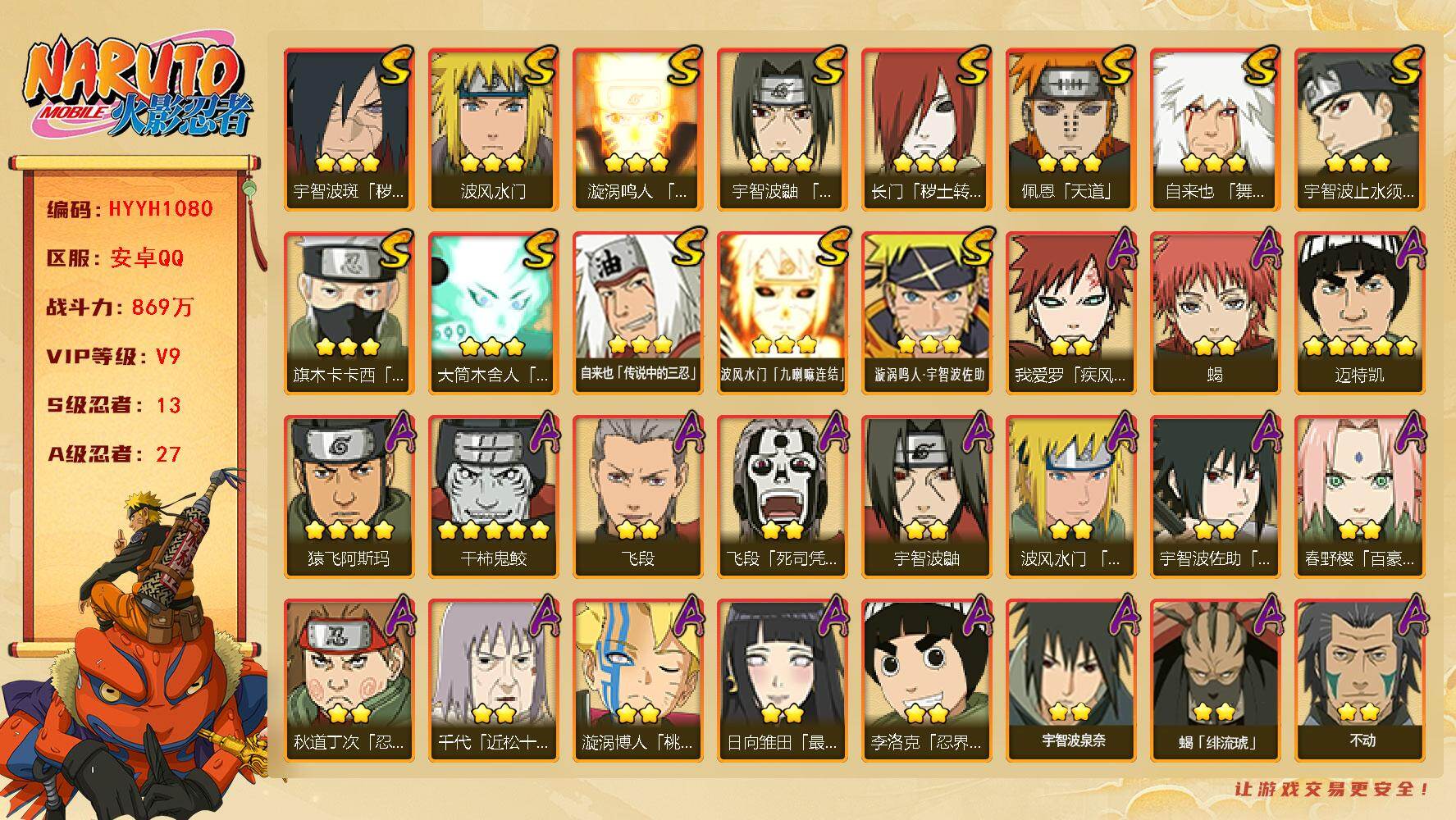 V9/战力869W/S忍13/A忍27/2星大野木「侠隐江湖」/疾风传-我爱罗/3星波风水门「九喇嘛连结」