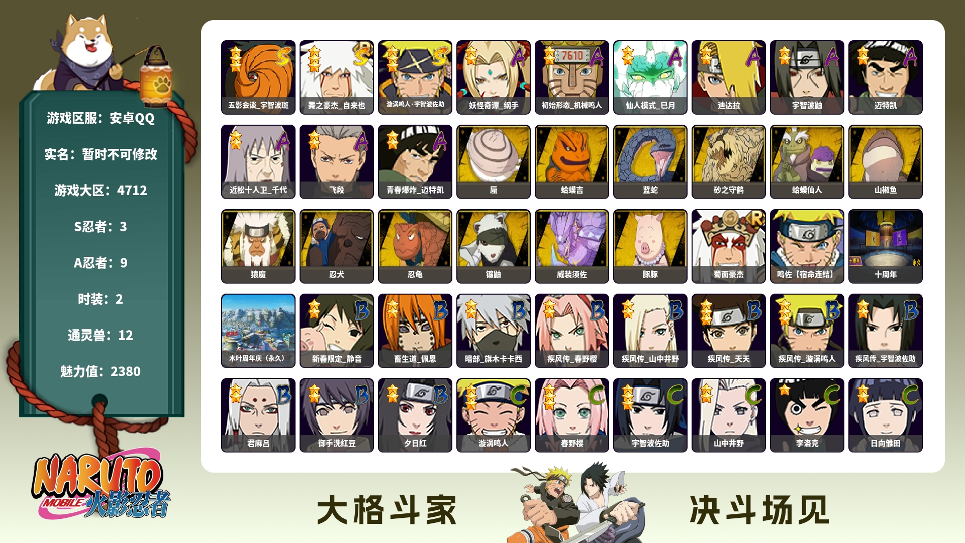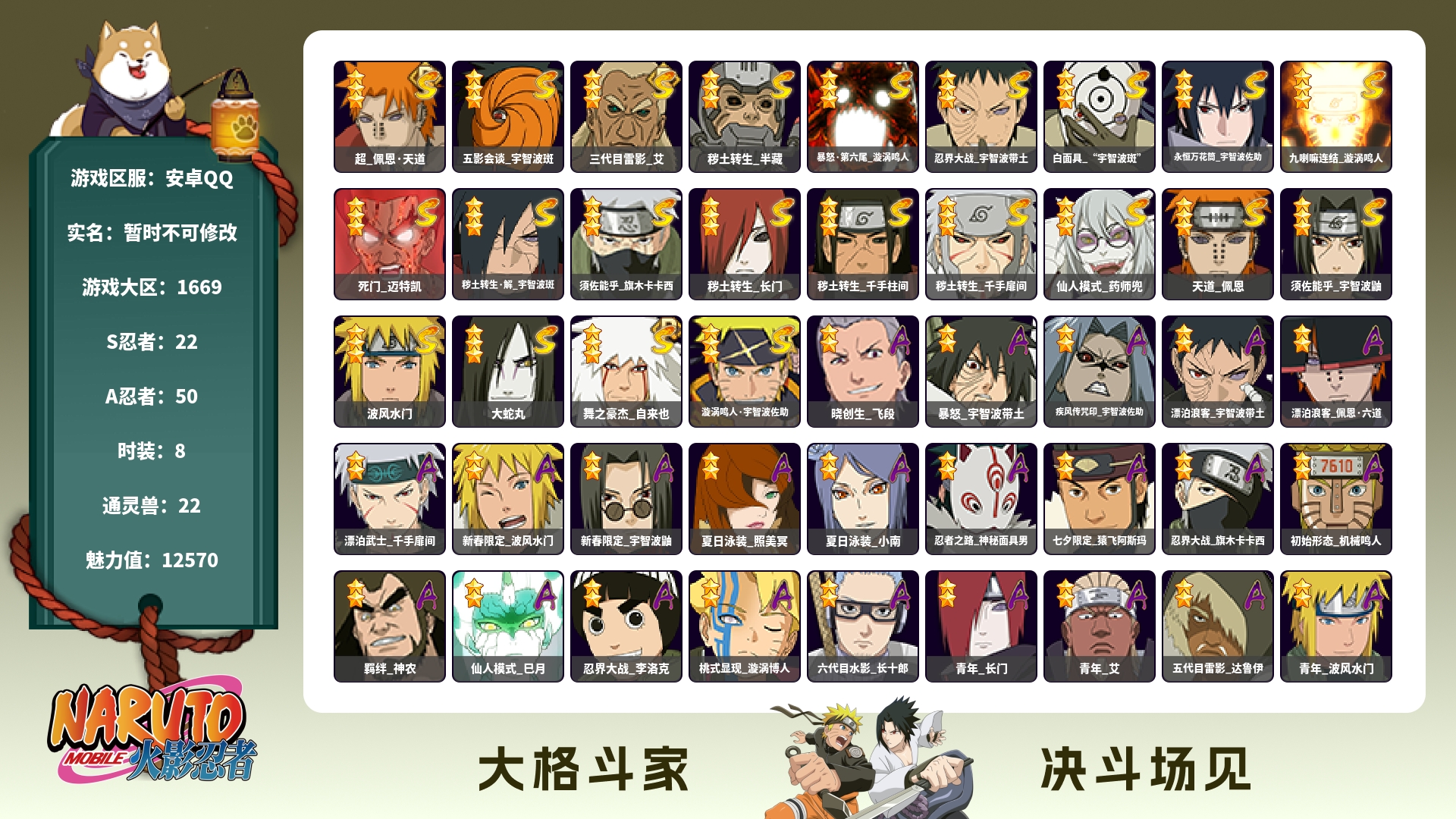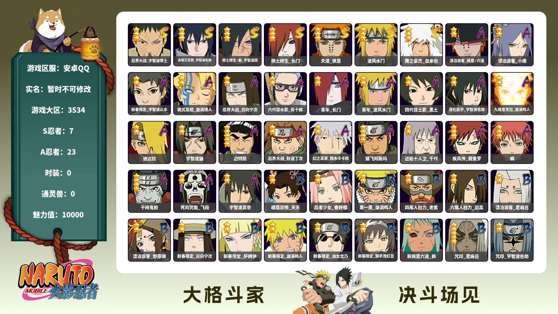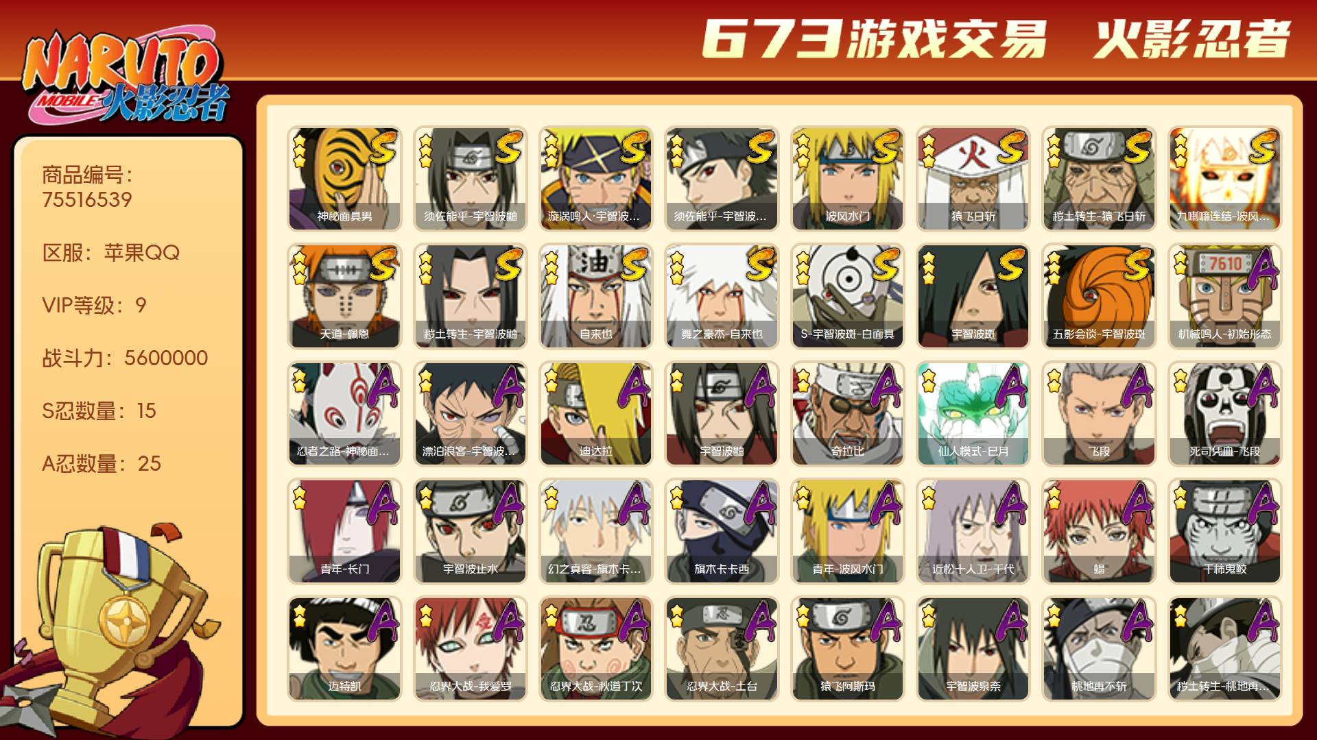 角色等级135 金币600 战斗力5600000 S忍15 A忍25 9 段位中忍