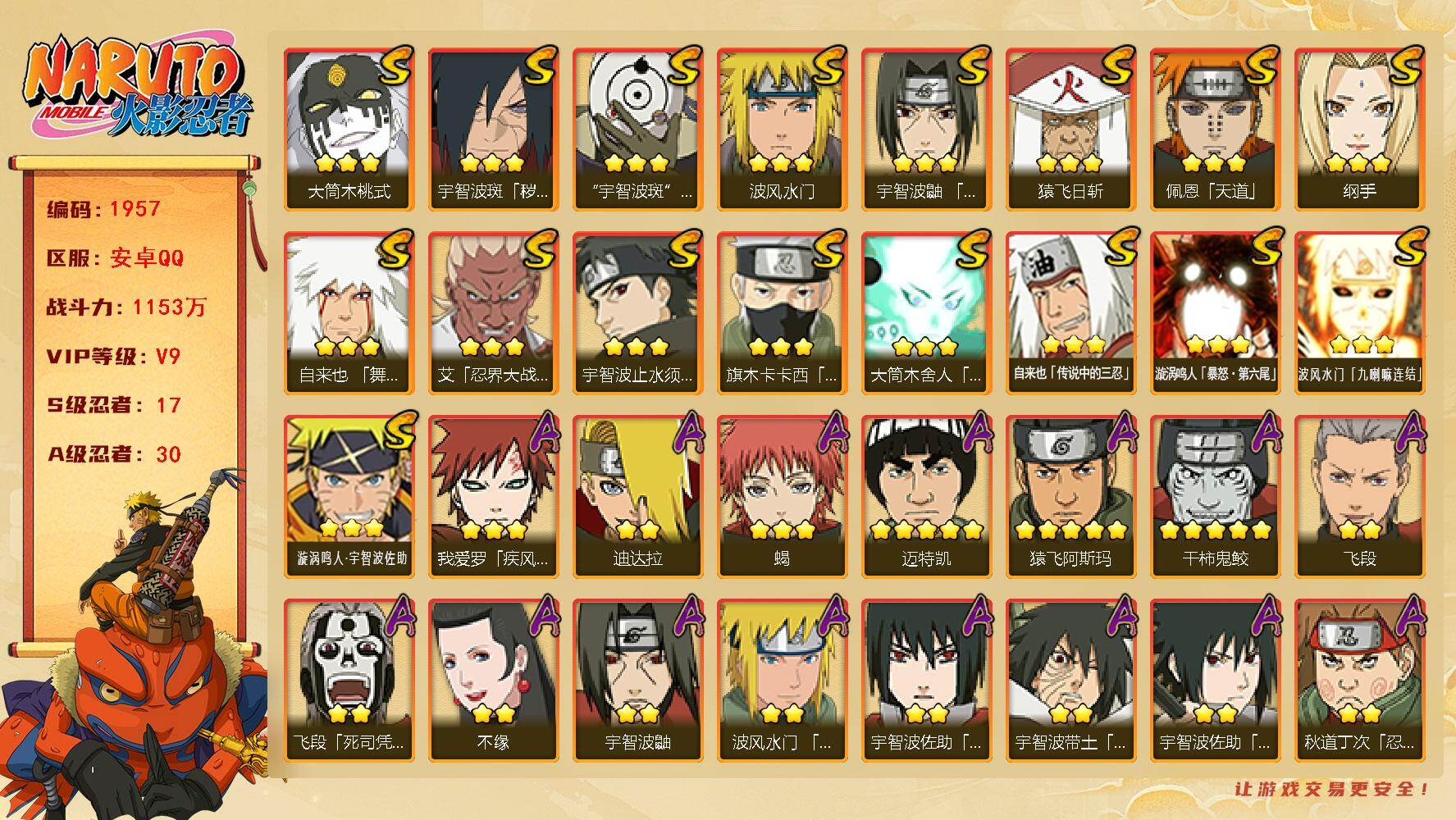 (可免费转苹果)v9 17S 30A 1153w战力 自来也83片 十尾带土5