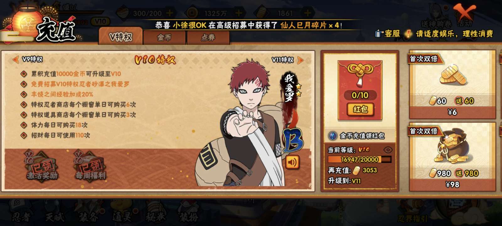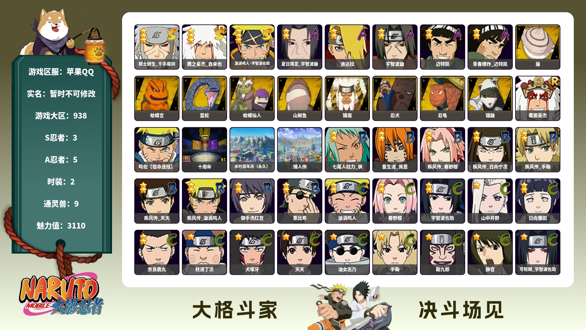 角色等级138 金币1000 战斗力5392567 S忍10 A忍28 10 段位见习