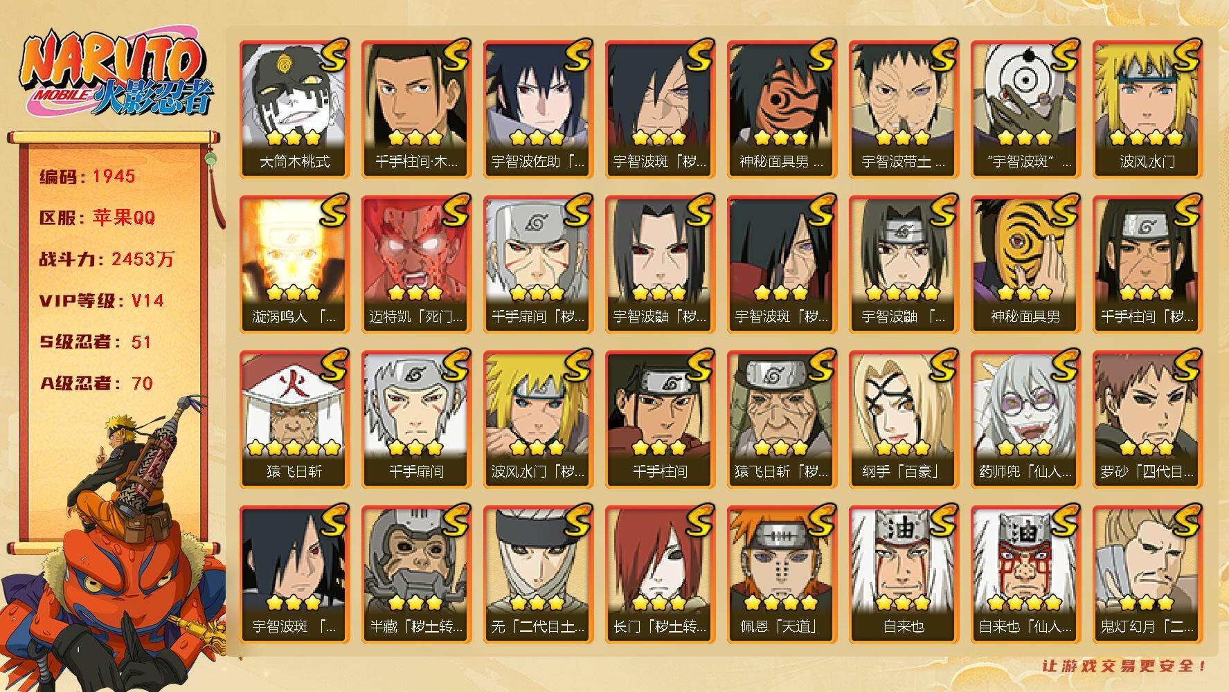 V14,51S,70A,2453万战力,已开神驹斑忍法帖,1.4万金币,热门A