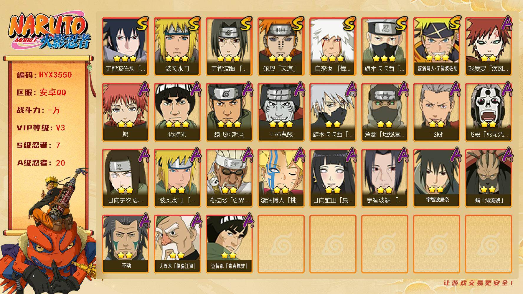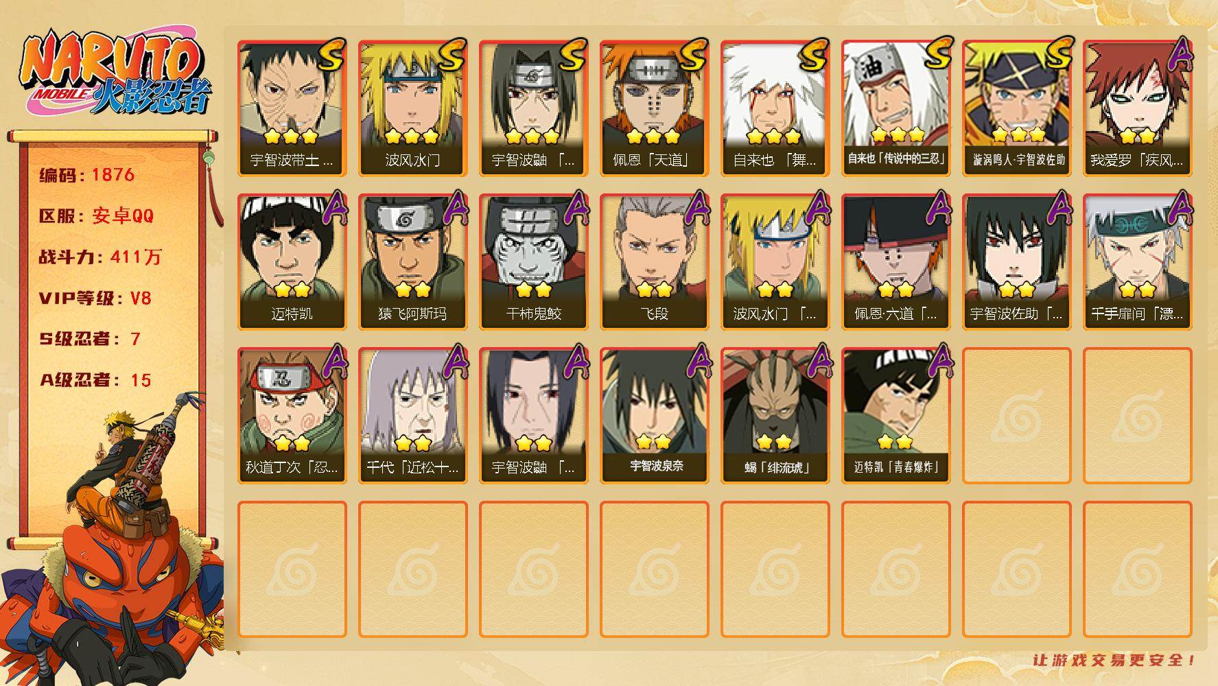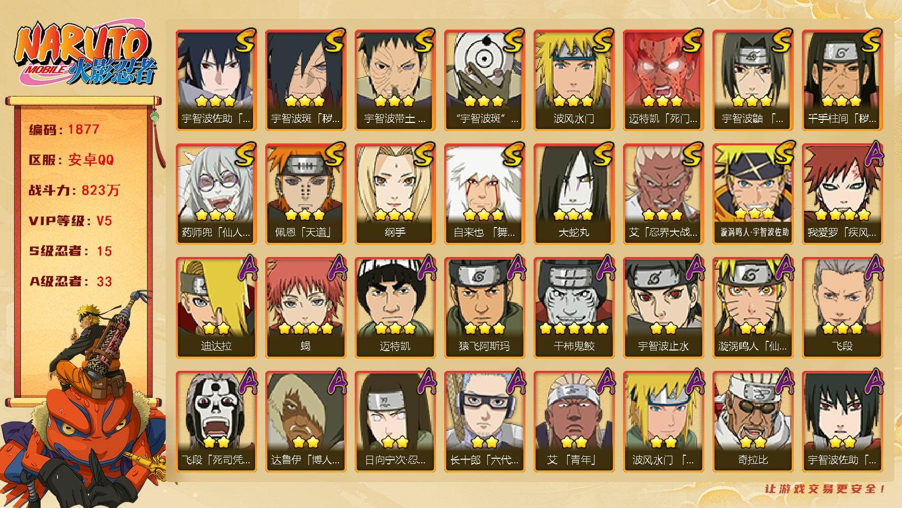 (可免费转苹果)V5 15S 33A 823万战力 热门A忍战我爱罗、七夕阿斯