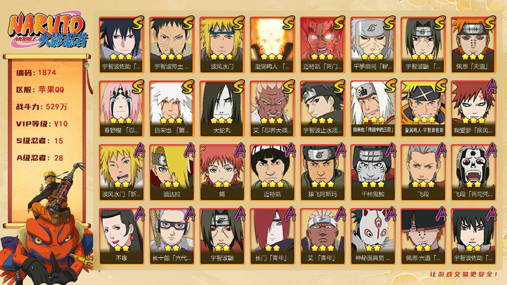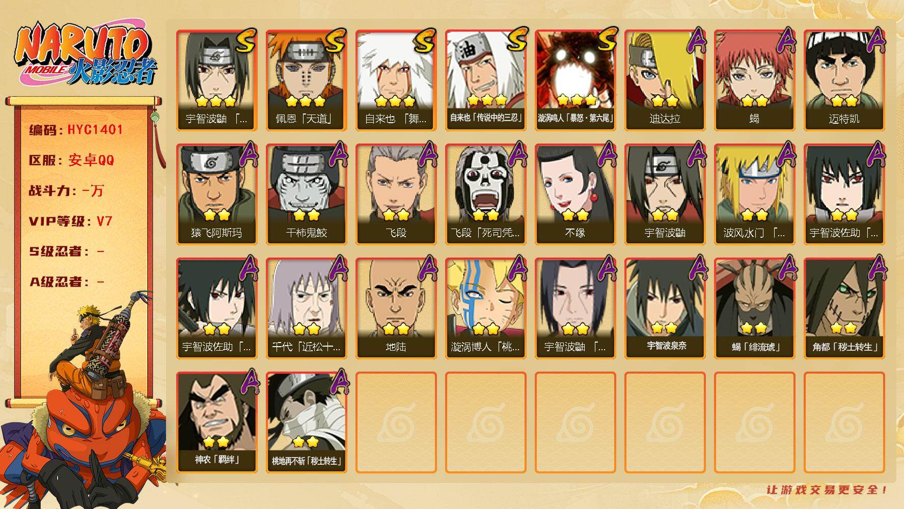 (可免费转苹果)V7 15S 29A 714万战力 2.4万金币 大蛇丸40片