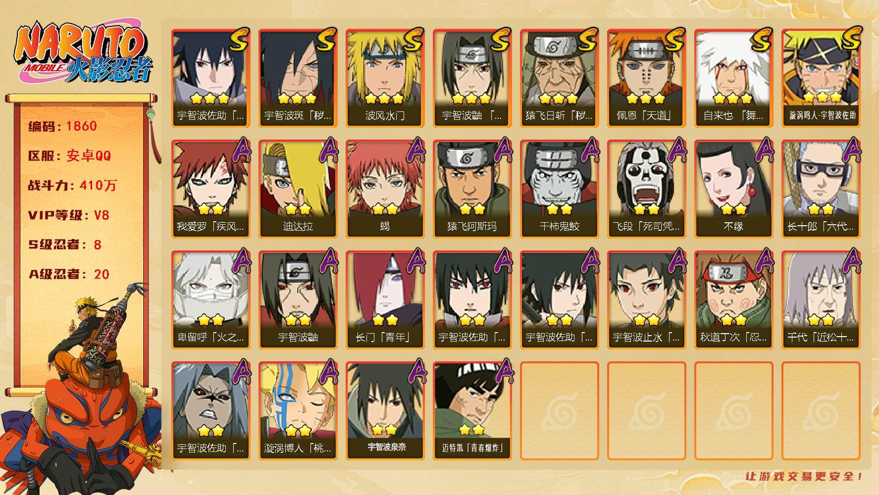 (可免费转苹果)V8,战力410W,8S级忍者数-20A级忍者数,有熊猫,九喇