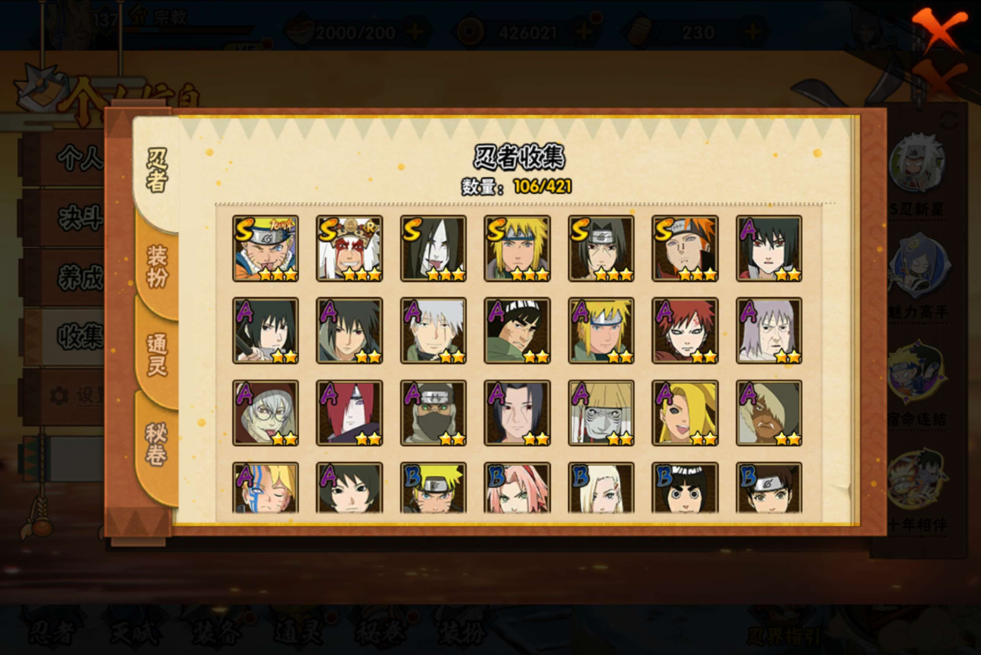 小李后高招全有,十尾带土50多片,现有两万多金币未花