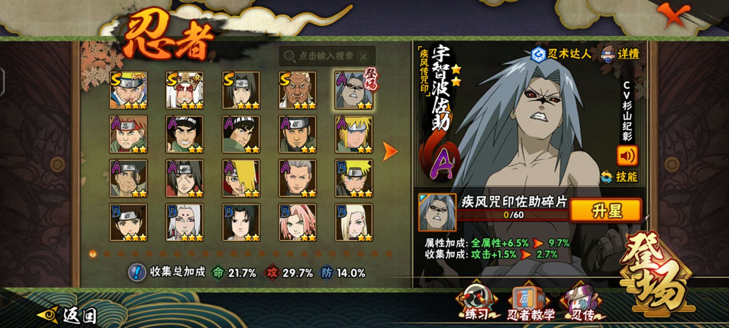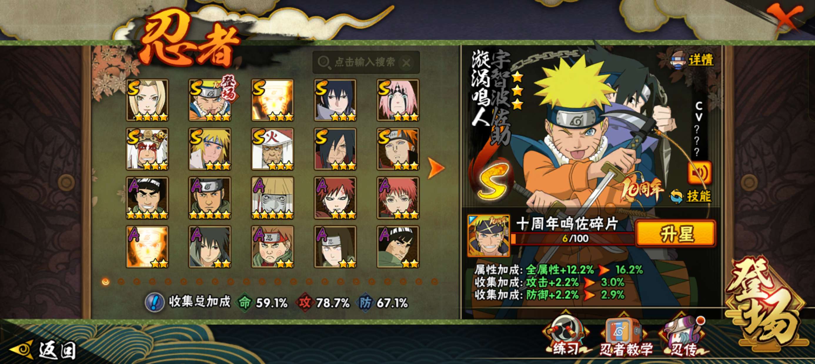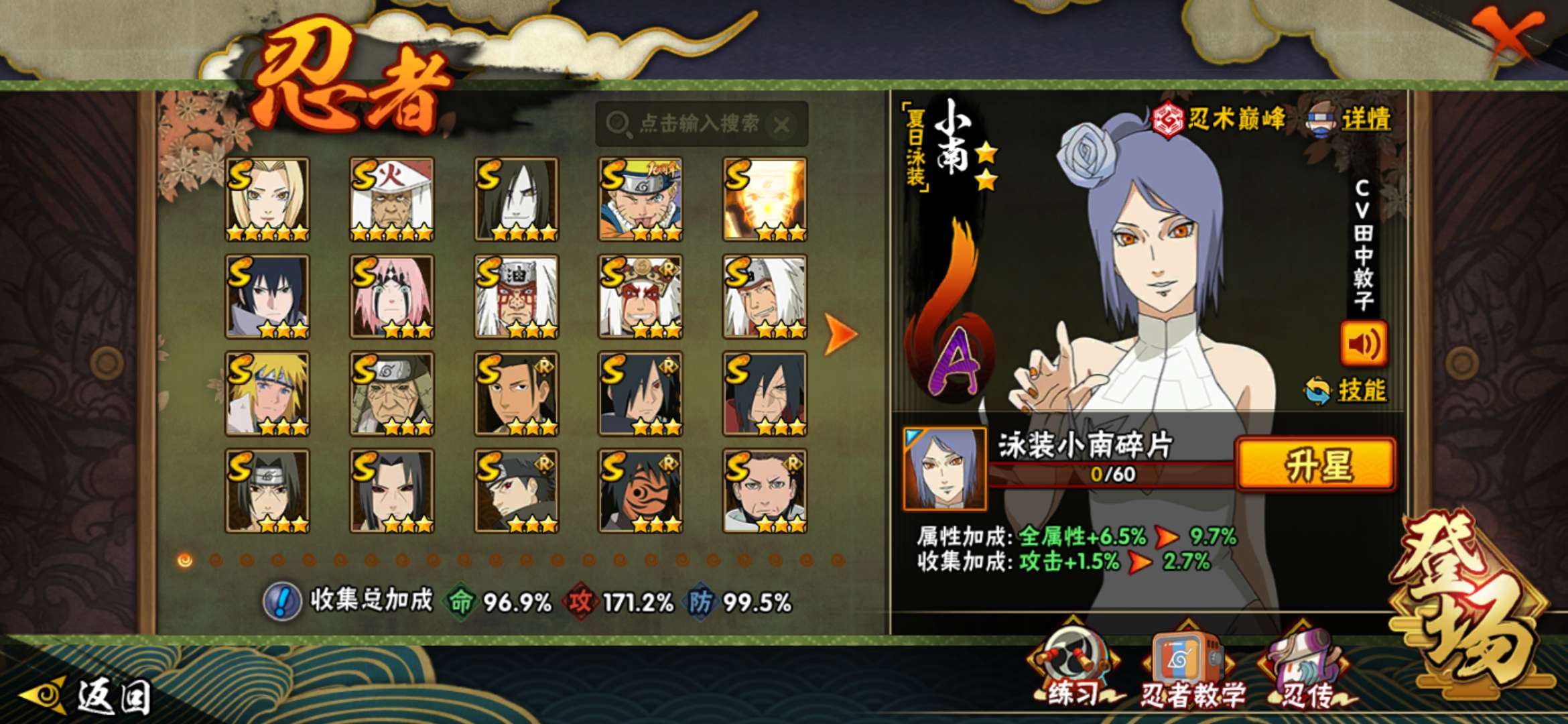角色等级136 金币4427 战斗力2229395 S忍10 A忍19 5星S忍者7 7 段位影级