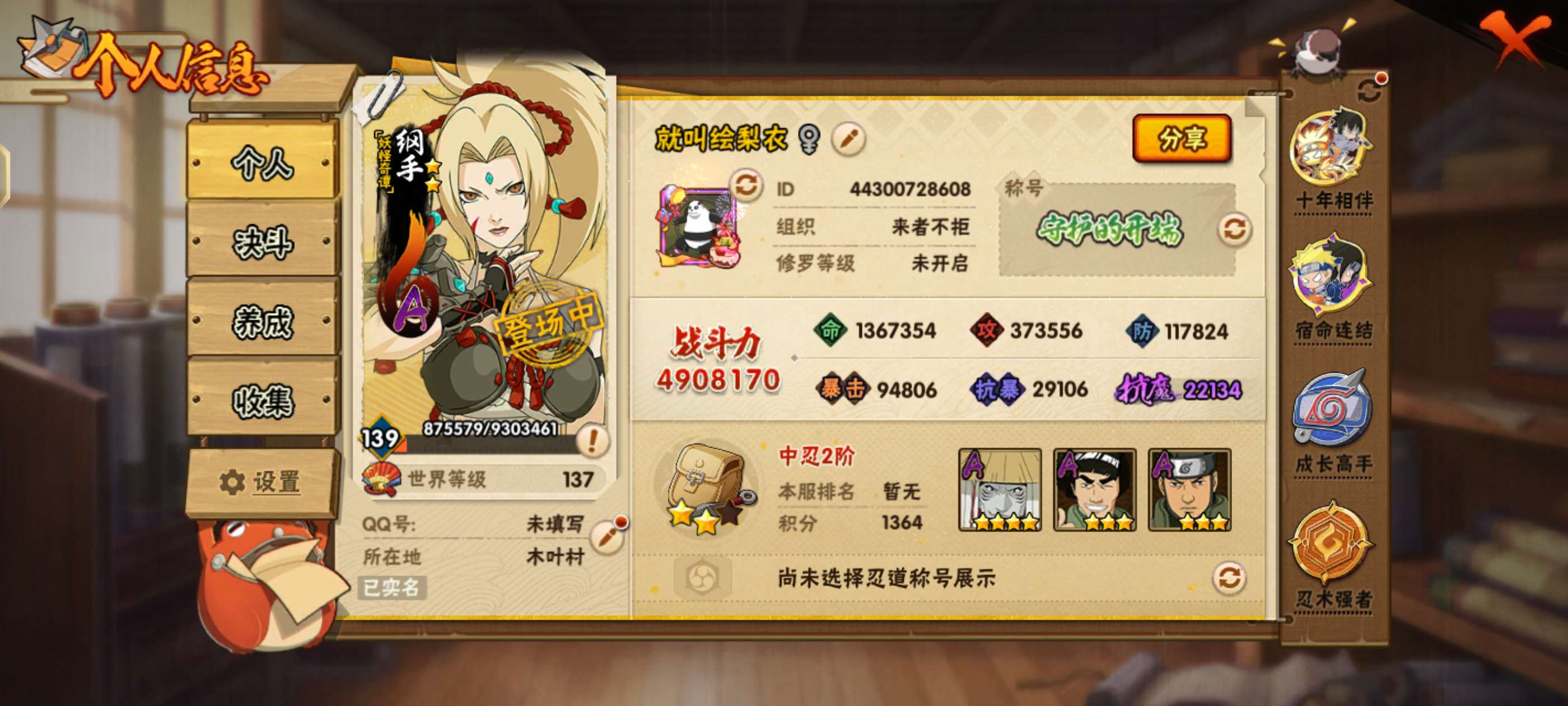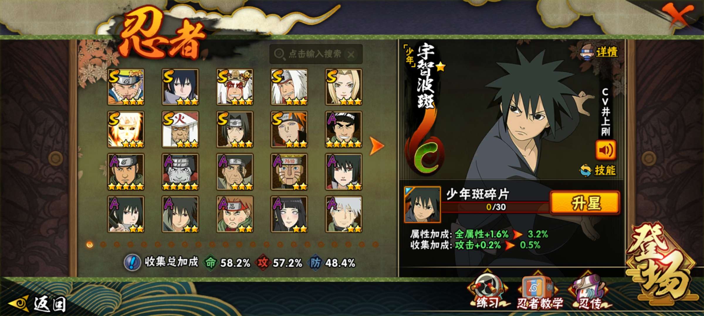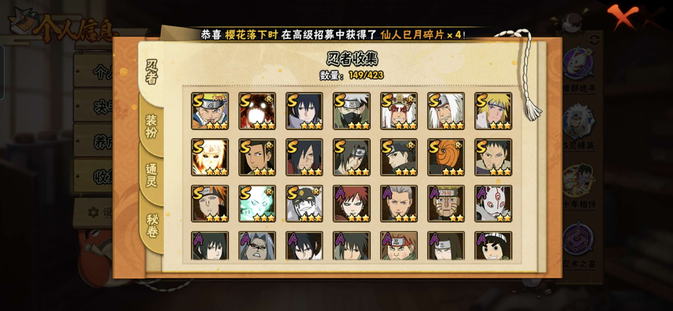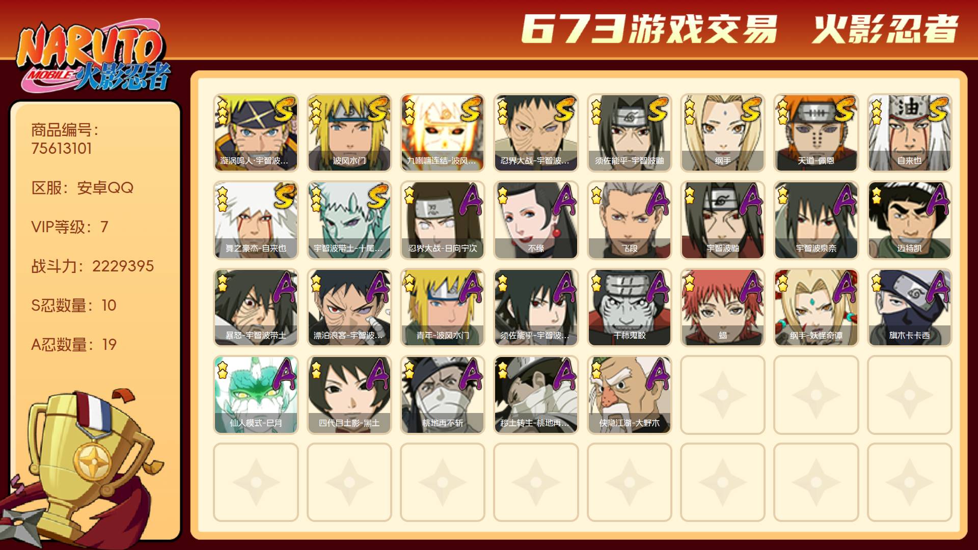 角色等级136 金币4427 战斗力2229395 S忍10 A忍19 5星S忍者7 7 段位影级