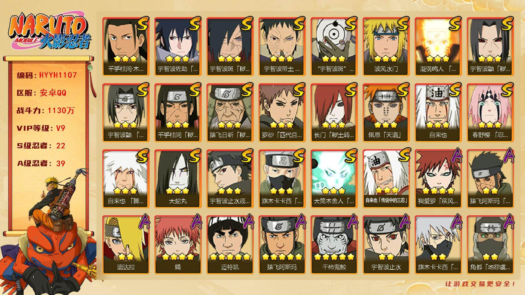 V9/战力1130W/S忍22/A忍39/五代目雷影-达鲁伊/死司凭血-飞段