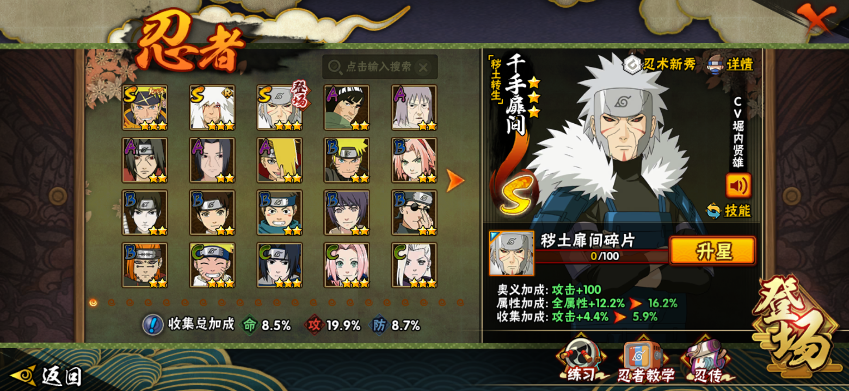 107W战力秽土扉间3S+泳装鼬5A战力107忍者总数31游