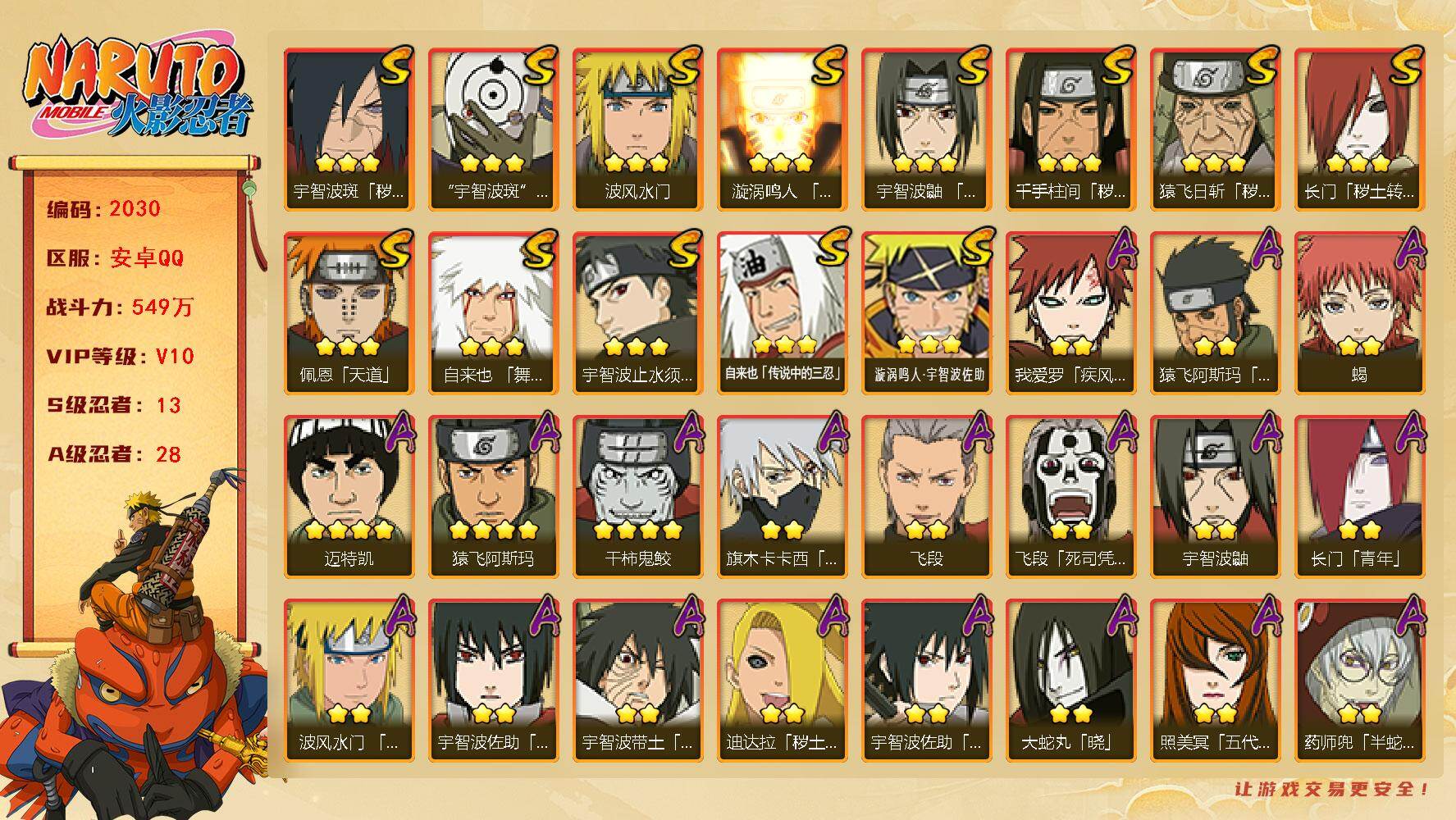 (可免费转苹果)V10 13S 28A 549万战力 热门A暴怒带土、漂泊小南