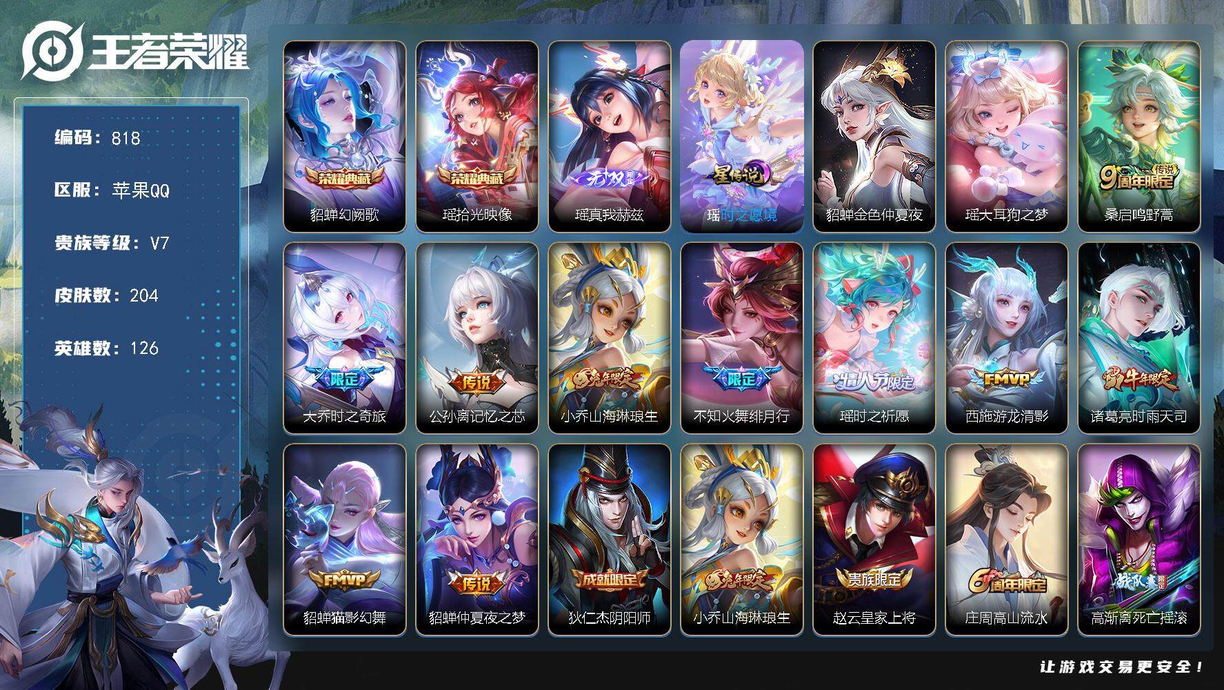 苹果QQ-2典藏-10传说-1无双-204皮肤-126英雄-尊贵铂金-苹果Q-V7-尊贵铂金III段位-126英雄-204皮肤-2典藏皮肤-1无双-