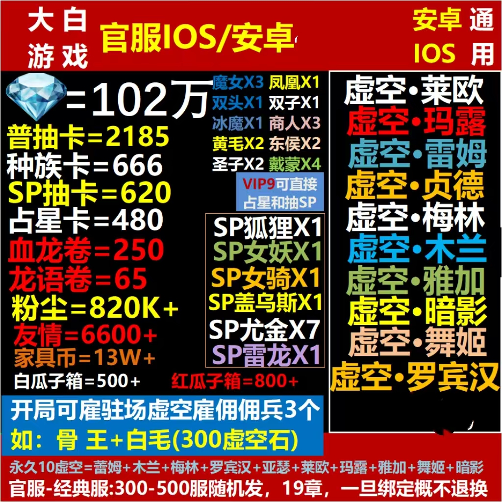 剑与远征【全服通用】【必带女妖+猴子】单号600-900抽,钻石10万-20万,种族卷20-40,普通卷300-400