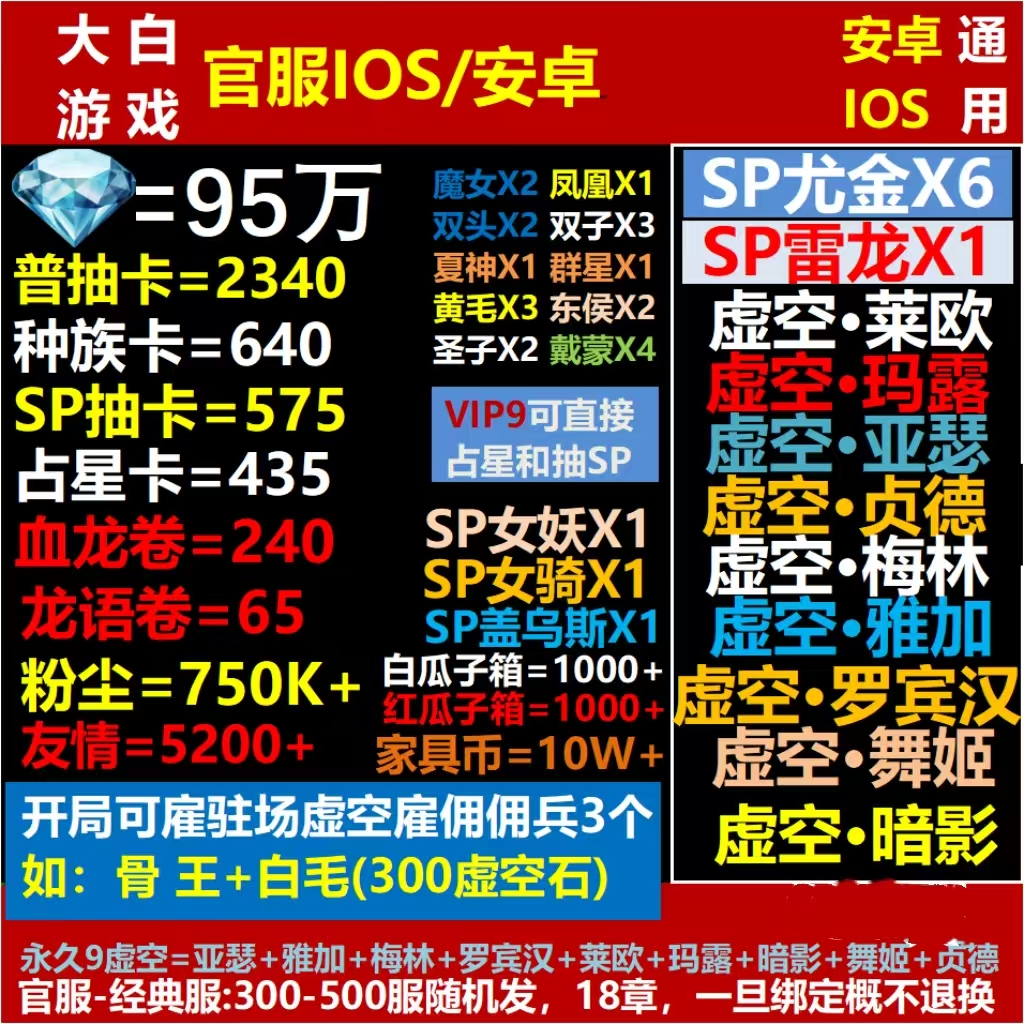 剑与远征【全服通用】官服如图描述:95万钻石大量人物