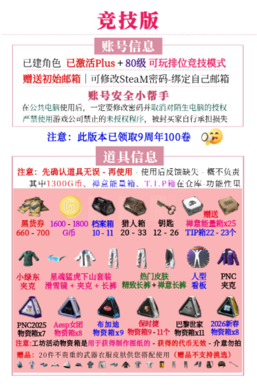 【竞技版 已激活PLUS+80级】详情看图帐号黑货票券皮肤武器帐号