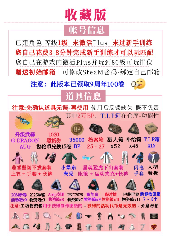 【收藏版=升级武器-AUG+档案箱+工坊箱】详情看图帐号黑货票券皮肤武器帐号