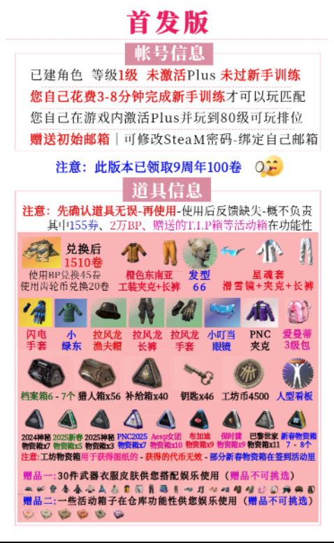 【标准版 已激活PLUS 1级 1300币】帐号黑货票券皮肤武器帐号