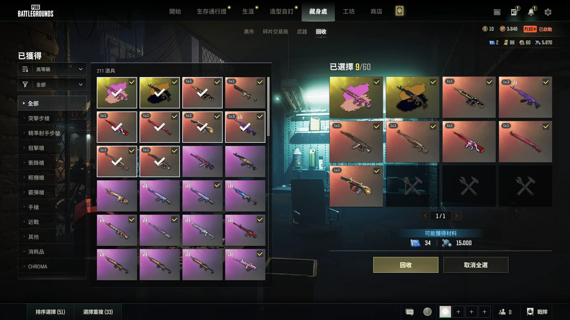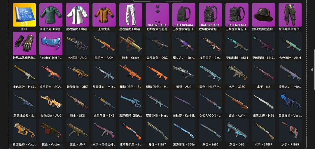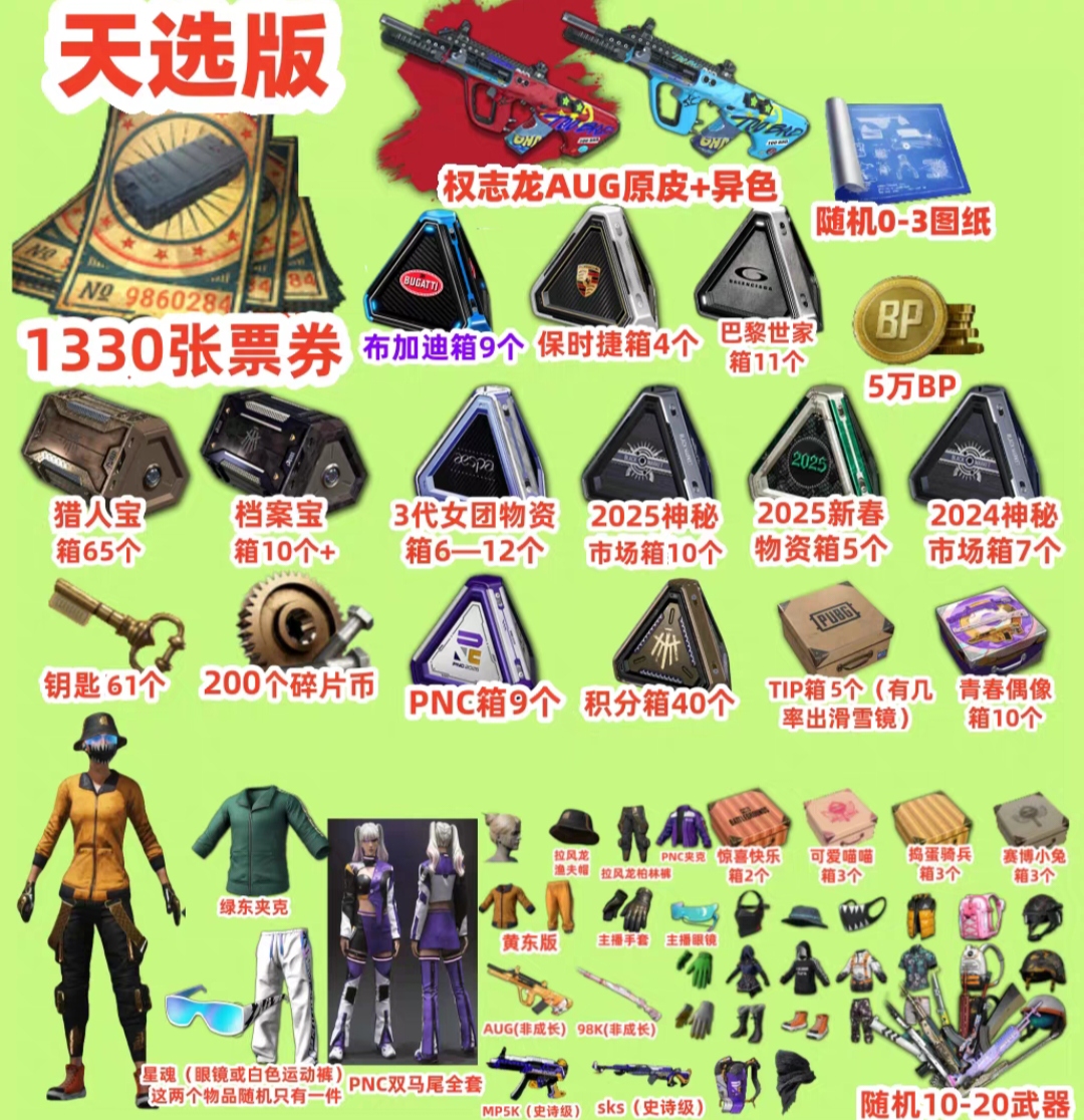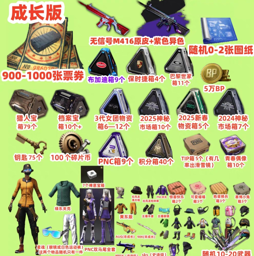黄东套,绿运动上衣,白运动上衣,白运动裤,巴黎世家比基尼和一二三级背包,各种枪皮,赠初始邮箱